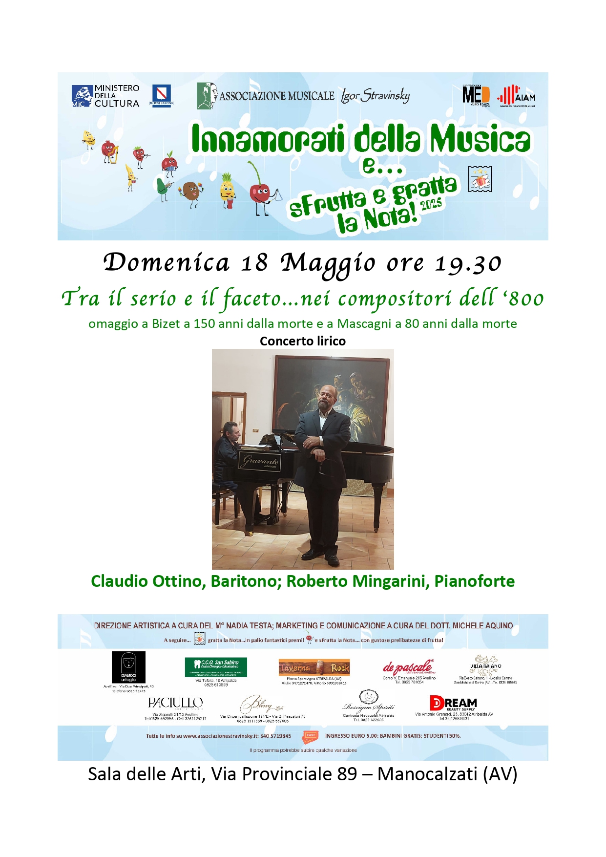 In serata, alle 19.30, il sipario si aprirà su 'Tra il serio e il faceto...nei compositori dell’800', recital che vedrà protagonisti lo stesso Claudio Ottino, baritono di fama internazionale, e Roberto Mingarini, pianista di lunga carriera, in un viaggio musicale tra le arie più celebri di Bizet e Mascagni, a cui si aggiungono brani di Tosti, Rossini, Gastaldon, Puccini e Donizetti.