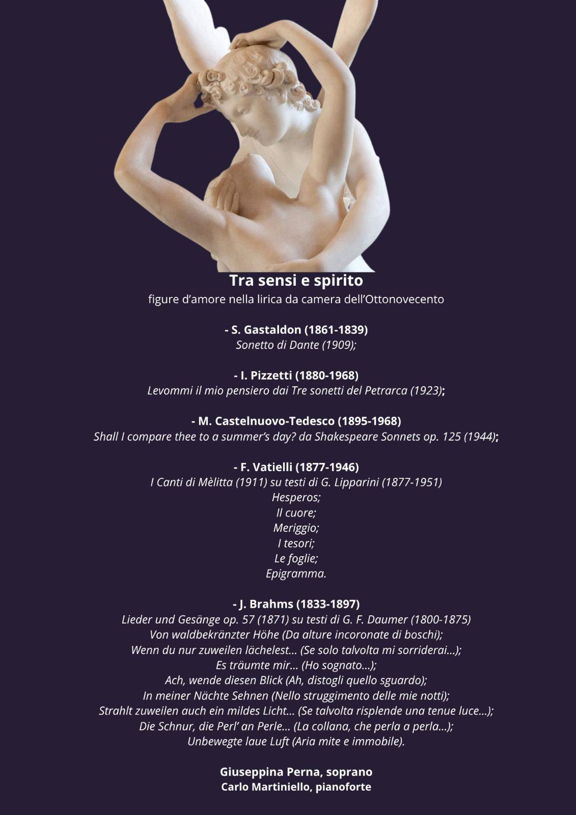 Un raffinato percorso musicale dedicato a celebri figure d'amore (da Dante a Petrarca, da Shakespeare alla poesia tedesca) magistralmente eseguito dal "Duo Algaia", composto dal soprano Giuseppina Perna e dal pianista Carlo Martiniello,