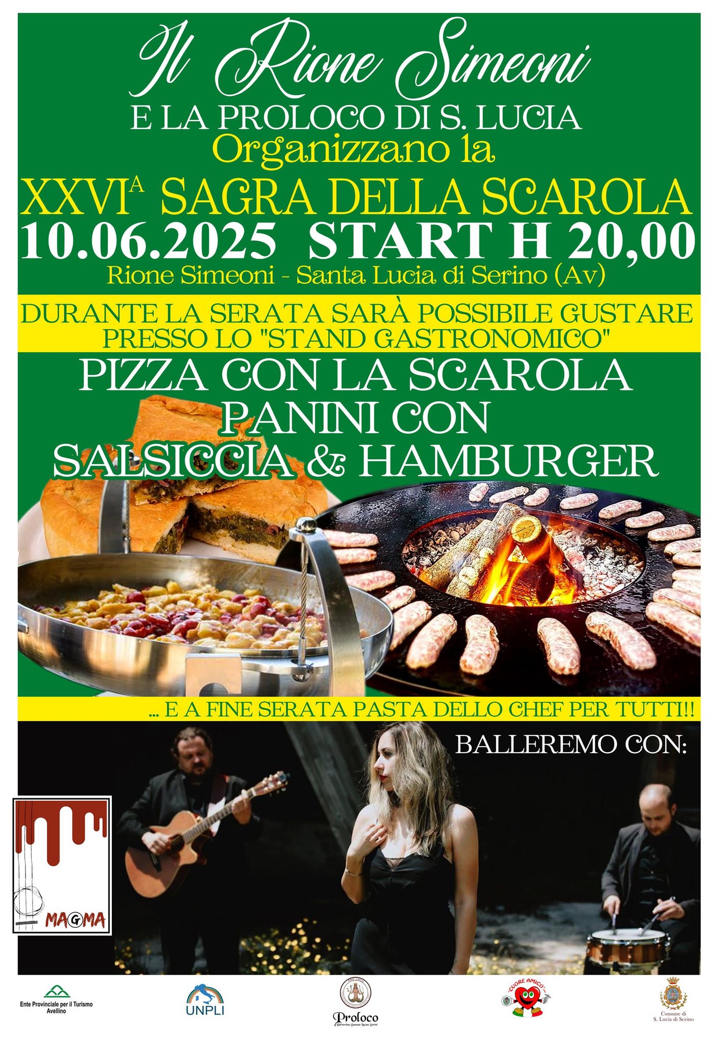 Martedì 10 giugno 2025, alle ore 20.00, a Santa Lucia di Serino, nel suggestivo scenario del Rione Simeoni, si terrà la 𝐗𝐗𝐕𝐈 𝐒𝐚𝐠𝐫𝐚 𝐝𝐞𝐥𝐥𝐚 𝐒𝐜𝐚𝐫𝐨𝐥𝐚, la prima sagra della stagione estiva, un evento che segna il ritorno di una storica manifestazione legata al folklore locale. La serata rappresenta un momento di forte richiamo alle tradizioni contadine del territorio, consolidandosi come un appuntamento di rilievo per la valorizzazione dell’identità culturale luciana. Non si tratta di una semplice esposizione enogastronomica, bensì di una vera e propria celebrazione della memoria collettiva, in cui il patrimonio immateriale si esprime attraverso i sapori autentici dei prodotti tipici e l’ospitalità della comunità. A rendere ancora più piacevole l’esperienza sarà la performance musicale dal vivo del Magma Acoustic Trio, che accompagnerà i presenti in un percorso sonoro coinvolgente e raffinato. L’iniziativa si propone quindi come un’occasione significativa per promuovere il territorio, offrendo un connubio di tradizione, cultura e intrattenimento in un contesto di aggregazione e condivisione.