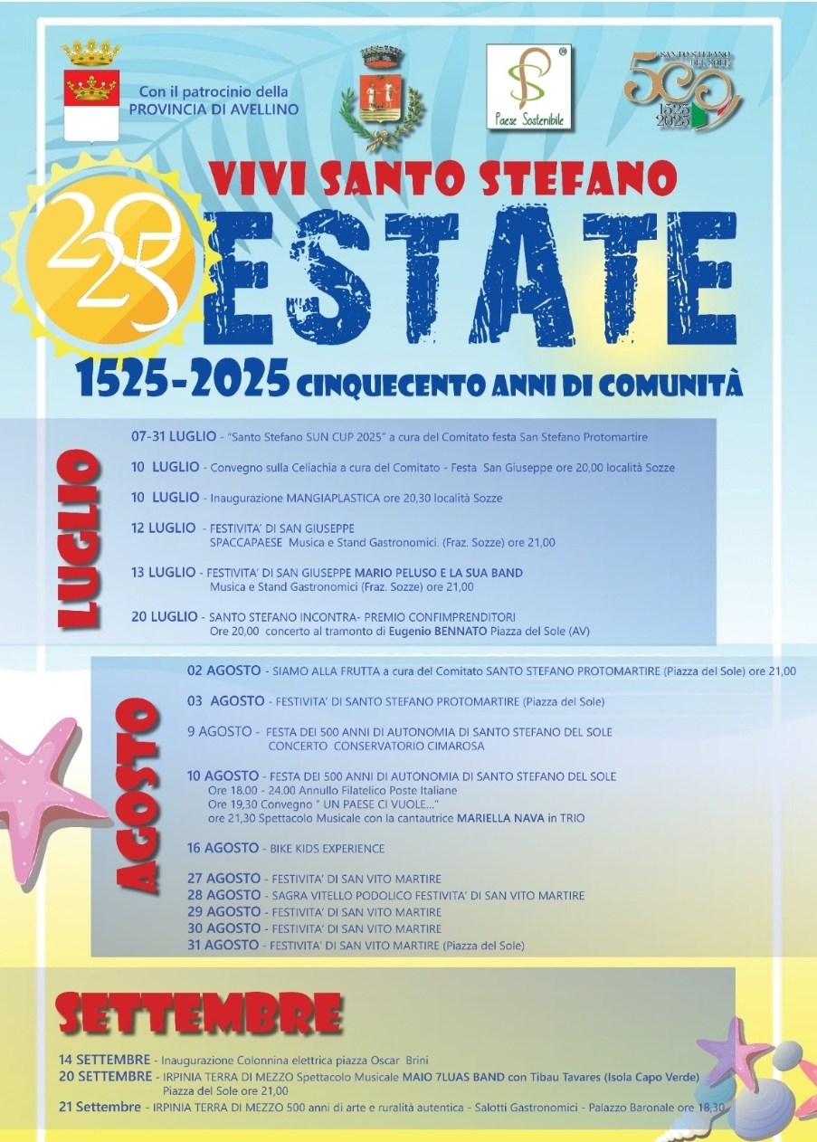 Prenderà il via il 7 luglio e si protrarrà fino al mese di settembre il ricco programma estivo ‘Vivi Santo Stefano 2025’, organizzato dal Comune in collaborazione con la Pro Loco, le associazioni e i comitati festa del territorio per celebrare i 500 anni di comunità.