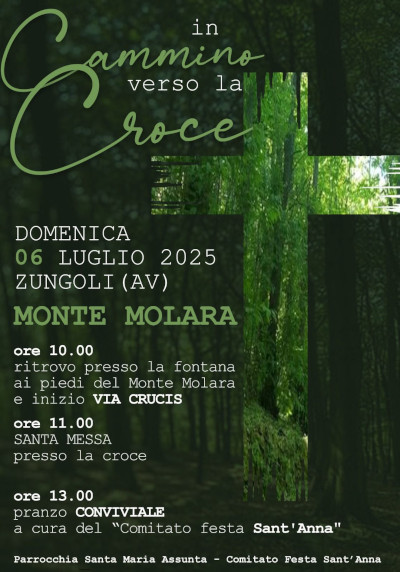 "In Cammino verso la Croce" prevede il ritrovo (ore 10.00) presso la fontana ai piedi del Monte con inizio Via Crucis. Alle ore 11.00 Santa Messa presso la croce. Alle ore 13.00 pranzo conviviale a cura del Comitato Festa Sant'Anna. "Ai piedi della croce" farà rivivere le tradizioni, custodi di memorie e delle nostre radici. Si ripercorrerà l'antico cammino della salita al Monte Molara giungendo ai piedi della croce costruita nel 1930. Da quel tempo faro della cristianità, visibile da Oriente ad Occidente. Un'autentica emozione per poi unirsi al pranzo del Comitato Festa. Ognuno potrà scegliere tra le varie pietanze proposte e pagare direttamente in loco.