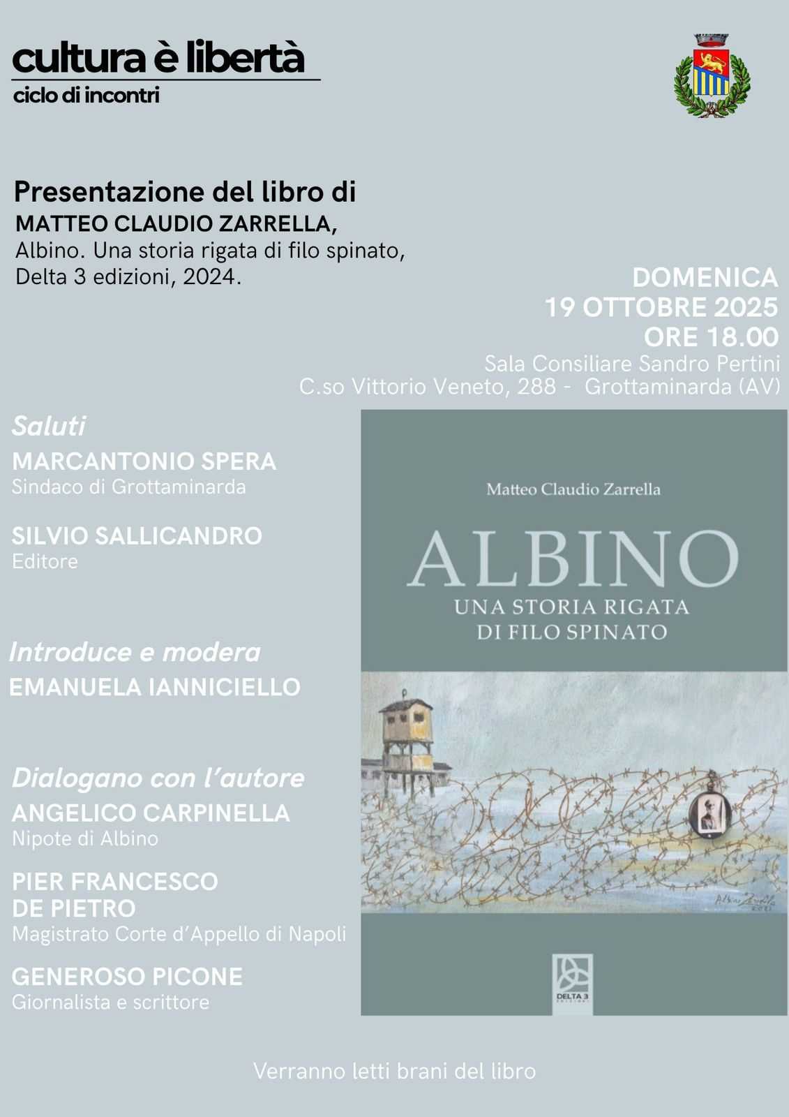 Domenica 19 ottobre, alle ore 18.00, nella Sala Consiliare Sandro Pertini di Grottaminarda, presentazione del libro "Albino. Una storia rigata di filo spinato" di Matteo Claudio Zarrella, Delta 3 Edizioni.