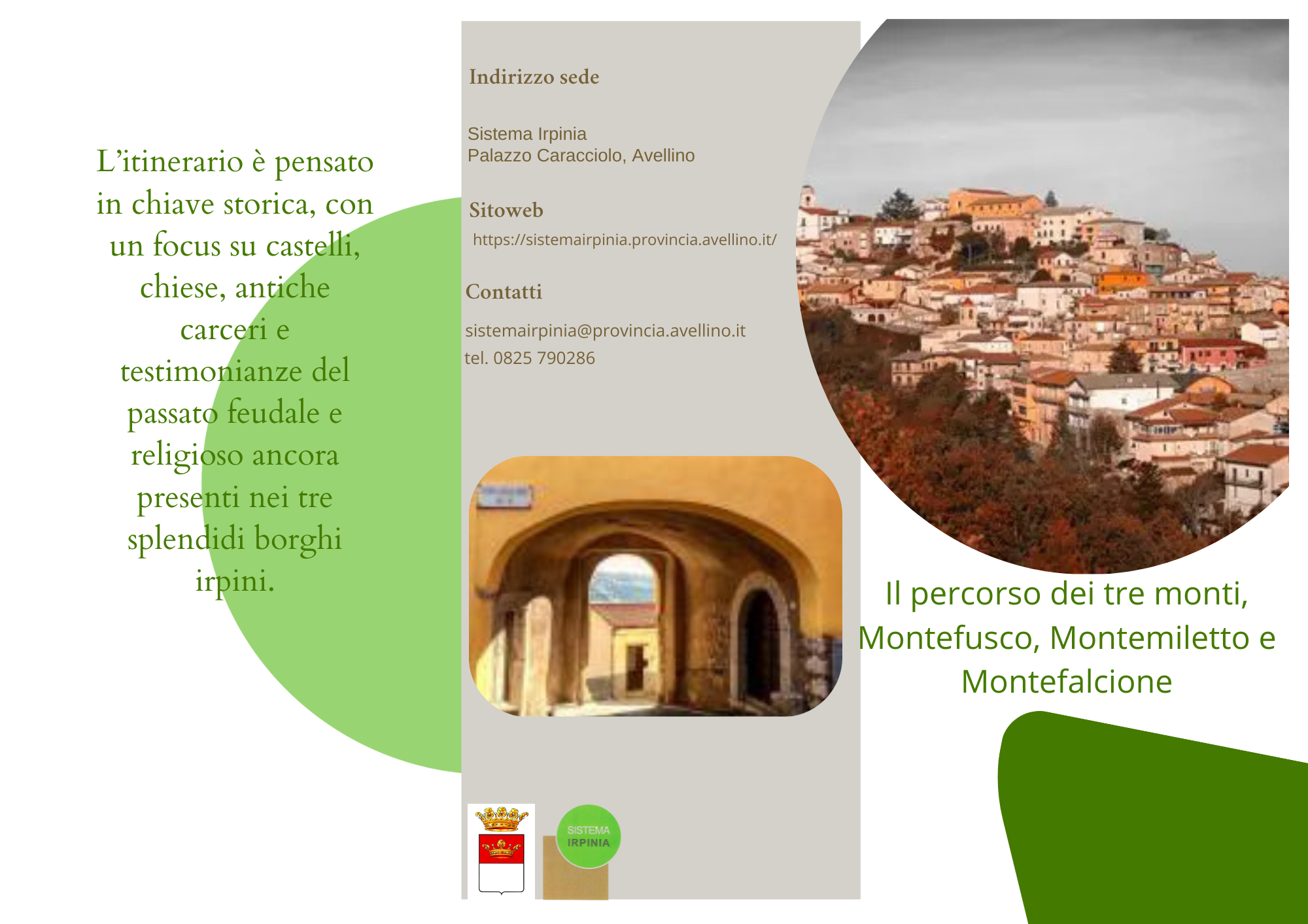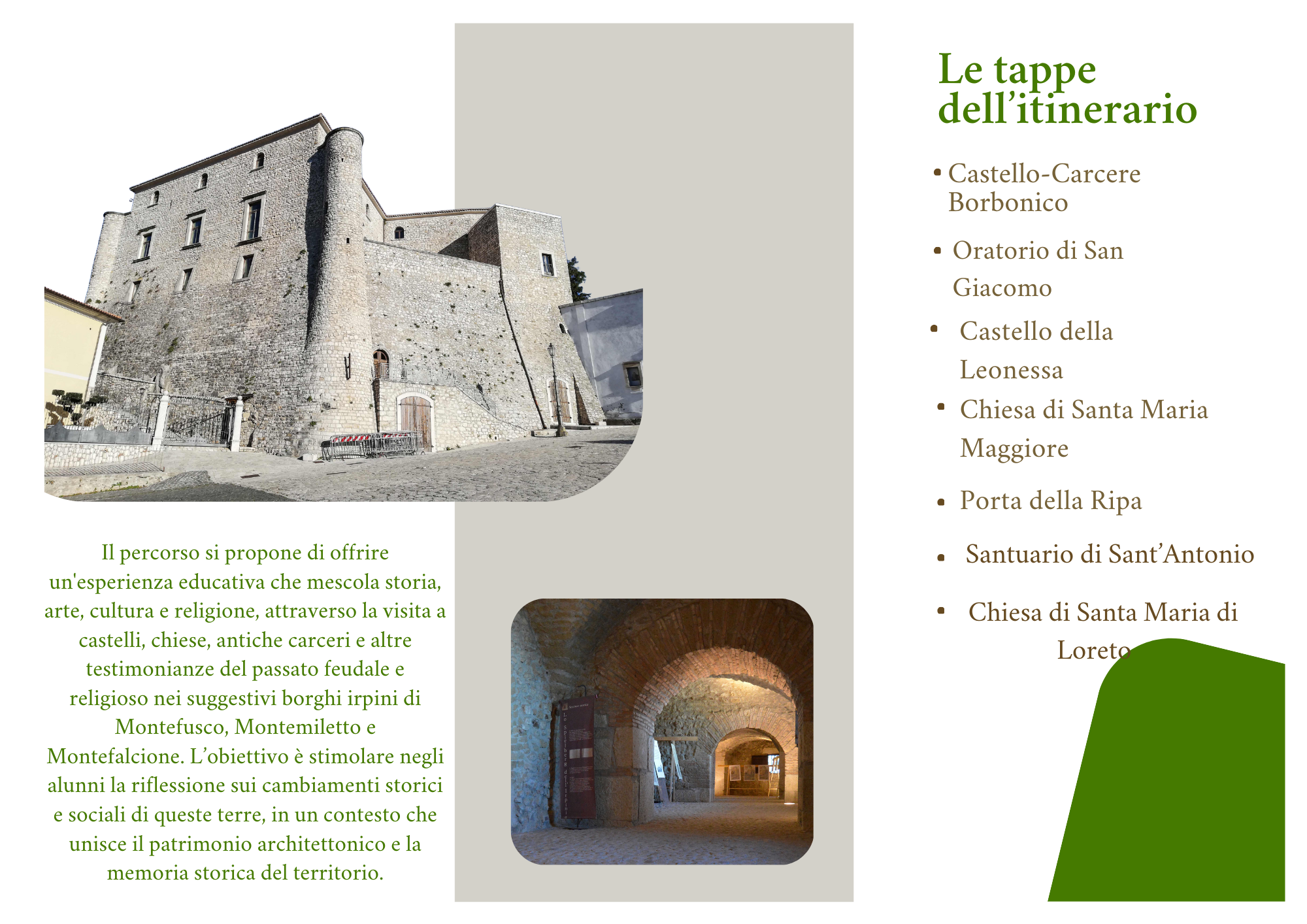 Il percorso si propone di offrire un'esperienza educativa che mescola storia, arte, cultura e religione, attraverso la visita a castelli, chiese, antiche carceri e altre testimonianze del passato feudale e religioso nei suggestivi borghi irpini di Montefusco, Montemiletto e Montefalcione. L’obiettivo è stimolare negli alunni la riflessione sui cambiamenti storici e sociali di queste terre, in un contesto che unisce il patrimonio architettonico e la memoria storica del territorio.