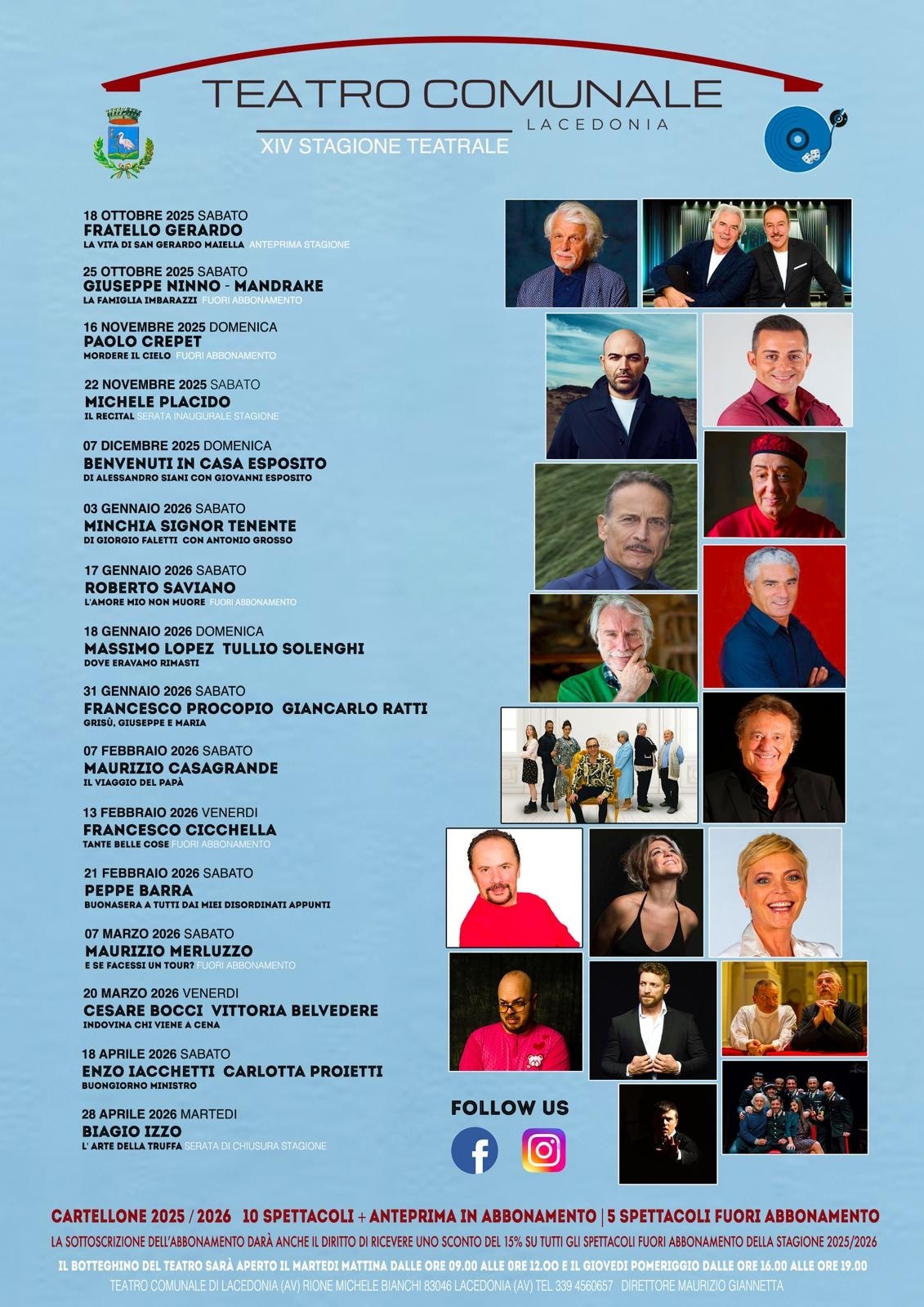 È stata ufficialmente presentata la XIV Stagione Teatrale del Teatro Comunale di Lacedonia, una rassegna che si preannuncia come una delle più ricche e affascinanti degli ultimi anni. L'Amministrazione Comunale ha voluto fortemente confermare, con questo nuovo cartellone, il proprio impegno nella promozione della cultura e dell’arte teatrale sul territorio, proponendo un programma capace di coinvolgere ogni tipo di pubblico.