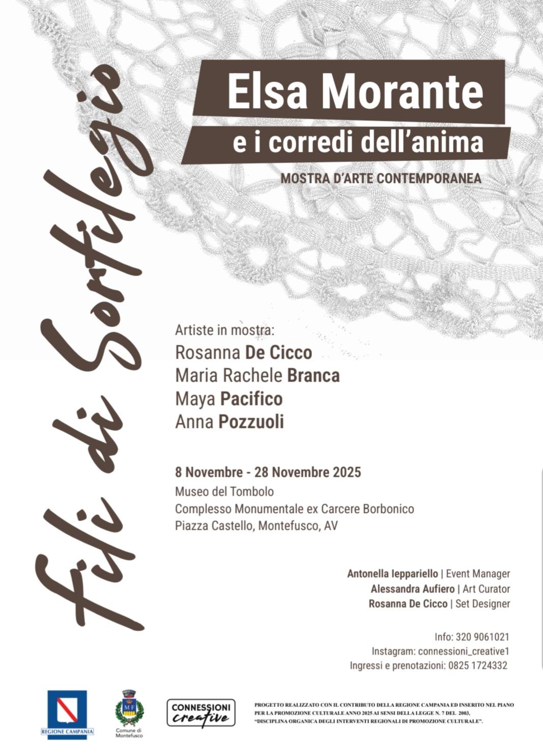 Dopo l’apertura istituzionale, alle ore 19:00 è previsto il vernissage presso il Museo del Tombolo dell’ex Carcere Borbonico, dove il pubblico potrà visitare per la prima volta la mostra “Fili di Sortilegio”.
