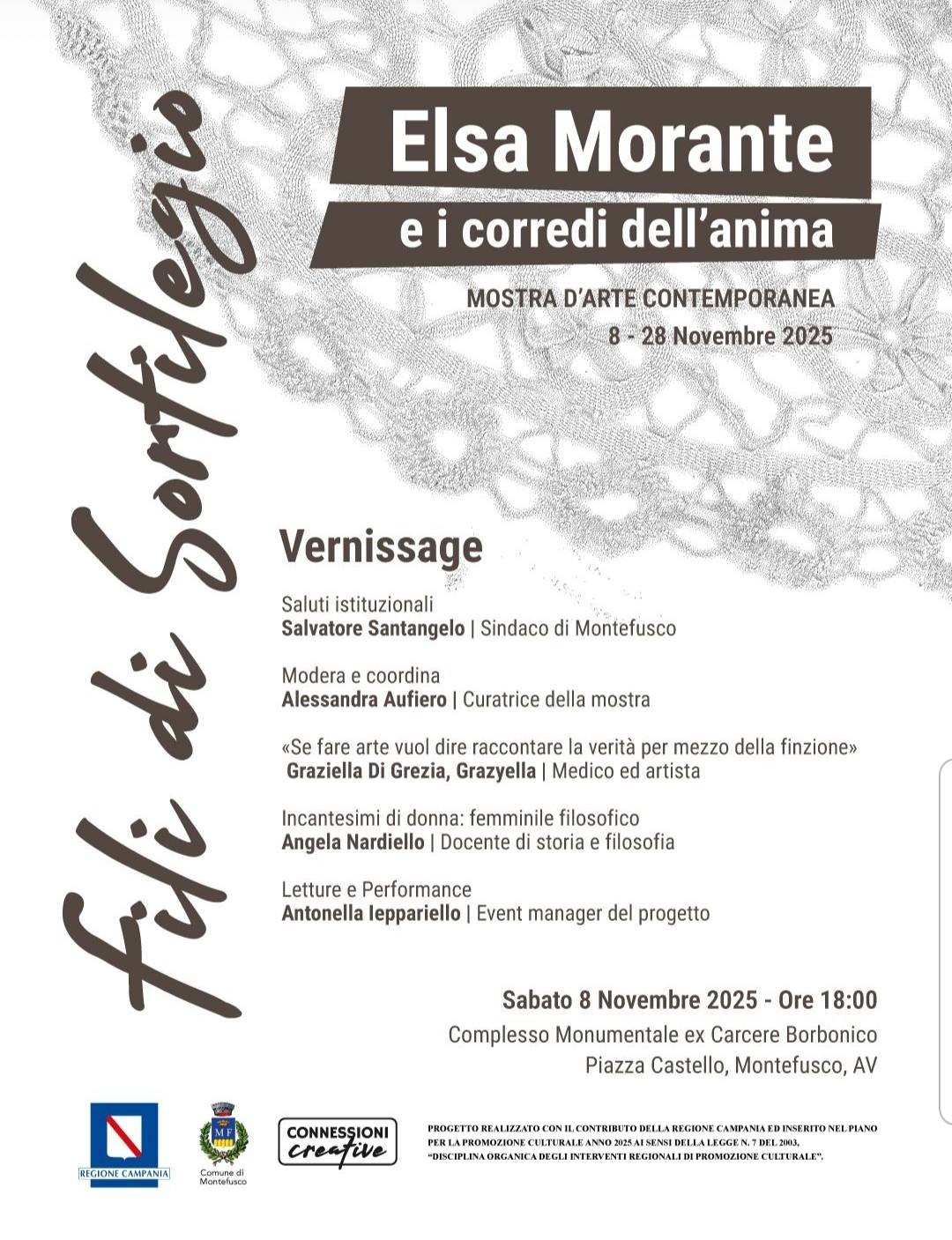 L’evento si apre l’8 novembre, alle ore 18:00, nella Sala Consiliare del Comune di Montefusco con un convegno inaugurale dedicato alla presentazione del progetto. La manifestazione è promossa dall’associazione Connessioni Creative, che ha ideato una mostra ispirata all’universo simbolico e narrativo del romanzo morantiano “Menzogna e sortilegio”.