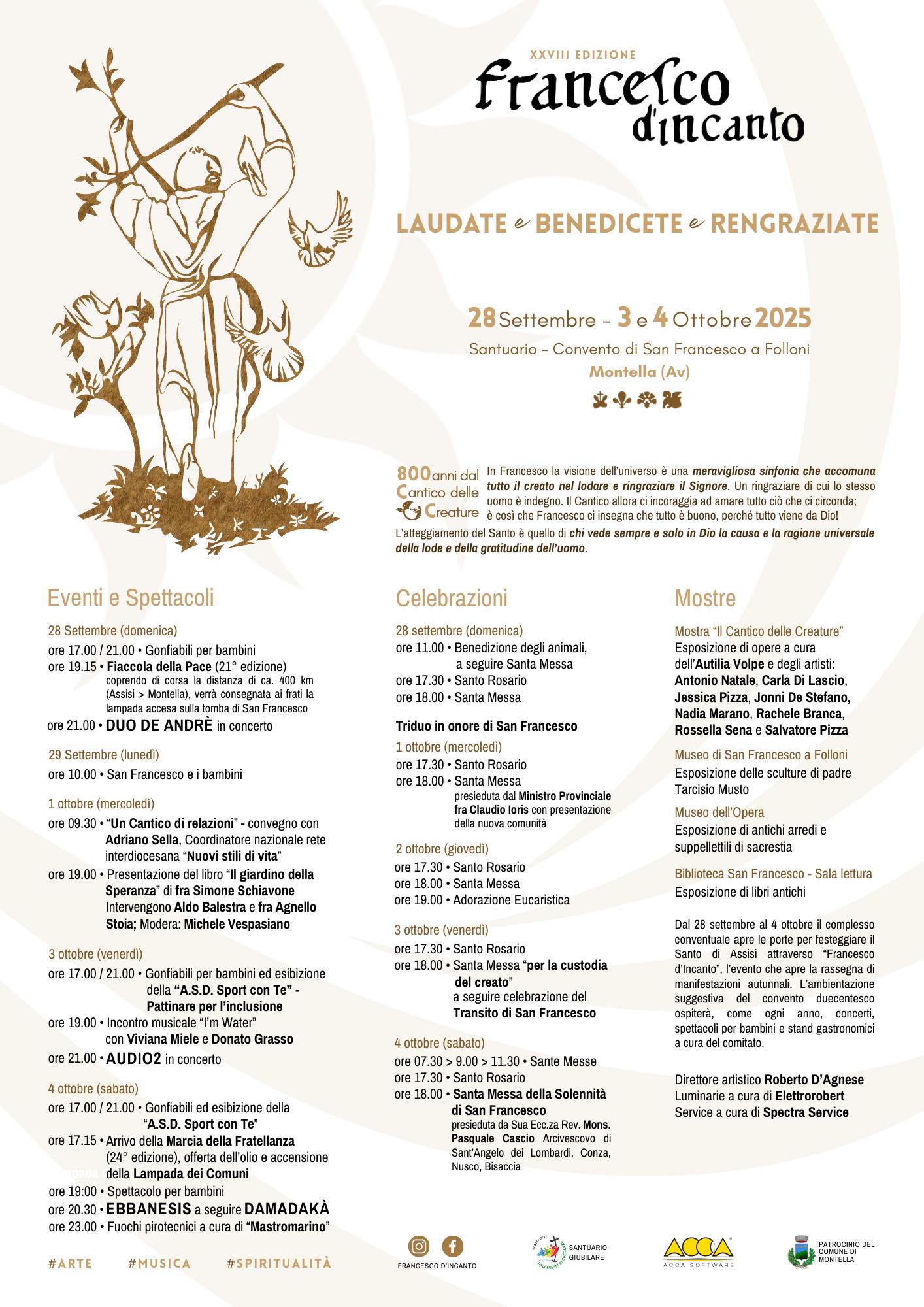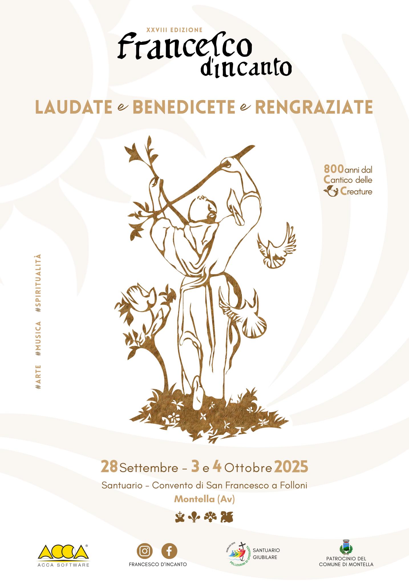 È entrata nel vivo la XXVIII edizione di Francesco d’Incanto, il festival che da quasi trent’anni trasforma il Santuario di San Francesco a Folloni , a Montella, in un luogo di incontro tra spiritualità, arte, musica e cultura. Il coordinamento artistico è affidato a Roberto D’Agnese per “Omast Eventi”, che anche quest’anno ha costruito un programma capace di coniugare tradizione e innovazione.