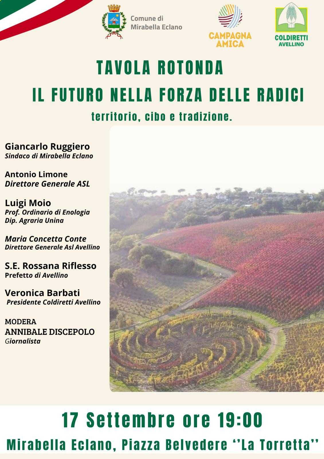 Si partirà mercoledì alle 17.00 in Piazza Belvedere “Torretta” con il laboratorio per bambini “Mani in pasta” e la merenda contadina a cura della Donne Coldiretti e si proseguirà alle 19.00 con una tavola rotonda intitolata "Il futuro nella forza delle radici: territorio, cibo e tradizioni". Moderati dal giornalista Annibale Discepolo, si confronteranno sul tema il professore Luigi Moio, ordinario di Enologia presso il dipartimento di Agraria dell'Università degli Studi di Napoli "Federico II"; la direttrice generale dell’ASL di Avellino, Maria Concetta Conte; il Prefetto di Avellino, Rossana Riflesso; il direttore generale dell'ASL di Caserta, Antonio Limone; il sindaco di Mirabella Eclano, Giancarlo Ruggiero, e la presidente di Coldiretti Avellino, Veronica Barbati.