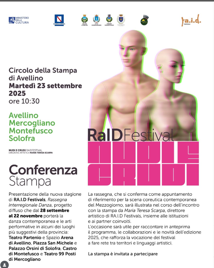 Presentata nella mattina del 23 settembre 2025, RA.I.D Festivals, Rassegna Interregionale Danza, pronta a tornare dal 28 settembre al 22 novembre 2025 con un cartellone scandito in 25 spettacoli e 16 date che intreccia ricerca, contaminazioni e internazionalità. Quest’anno il festival accoglie compagnie provenienti dalla Spagna e dal Canada, affiancate a maestri e giovani talenti italiani. Una rassegna che trasforma il territorio in un palcoscenico a più voci, abbracciando sei luoghi di Avellino, Solofra, Mercogliano e Montefusco.