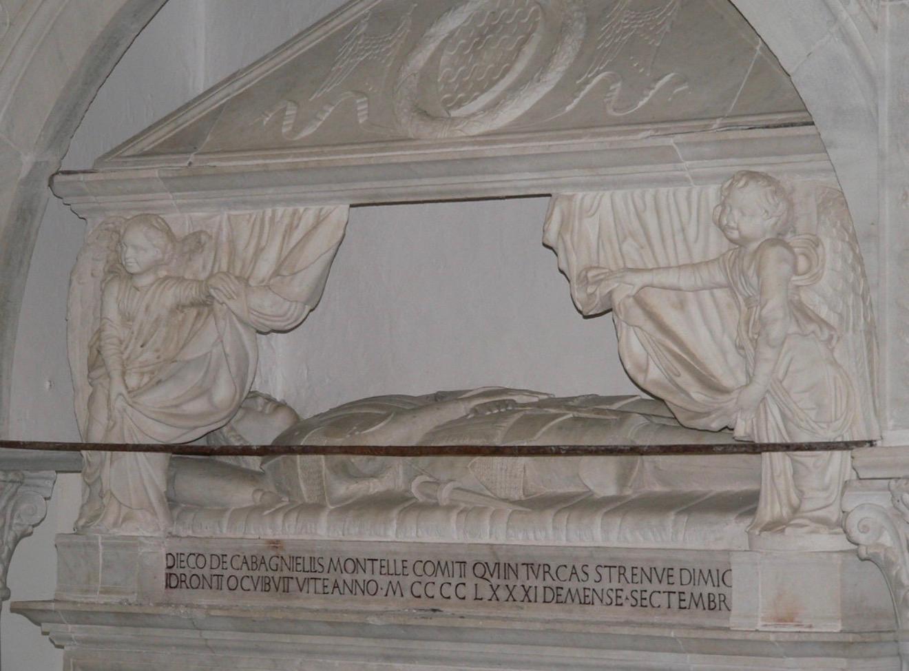 La sua storia è insieme tragica e romantica: figlio della potente famiglia Cavaniglia, originaria di Valencia e giunta nel Regno di Napoli con Alfonso V d’Aragona, Diego si distinse per valore e strette relazioni con la corte aragonese. Sposatosi con Margherita Orsini dei duchi di Gravina, nel1477 ereditò dal fratello il titolo di conte di Montella. Nel 1481 partì con i suoi uomini per la campagna contro i Turchi impegnati nell’assedio di Otranto: colpito da una ferita durante la battaglia, morì poco dopo in un castello di Copertino ancora giovane, all’età di circa 28 anni. Secondo le fonti storico-artistiche, il sepolcro, che si trova nella sacrestia della chiesa del convento di San Francesco a Folloni, fu commissionato dalla moglie Margherita Orsini, che volle onorare la memoria del marito con un monumento di grande valore artistico e attribuito allo scultore rinascimentale Jacopo della Pila. Realizzato intorno al 1481-1492instilerinascimentale, il sepolcro presenta un sarcofago sostenuto da figure allegoriche delle virtù cardinali: Prudenza, Giustizia e Temperanza, simboli dei meriti morali e cavallereschi del defunto. Nel corso della storia locale, questo sepolcro è stato interpretato non solo come un comune monumento funebre, ma anche come segno di un amore profondo tra il conte Diego e Margherita Orsini. La presenza delle virtù come sostegno del sarcofago, l’epigrafe incisa e la devozione della moglie–che volle essere sepolta accanto a lui molti anni dopo–hanno fatto sì che la tradizione popolare lo identifichi come il monumento degli innamorati.