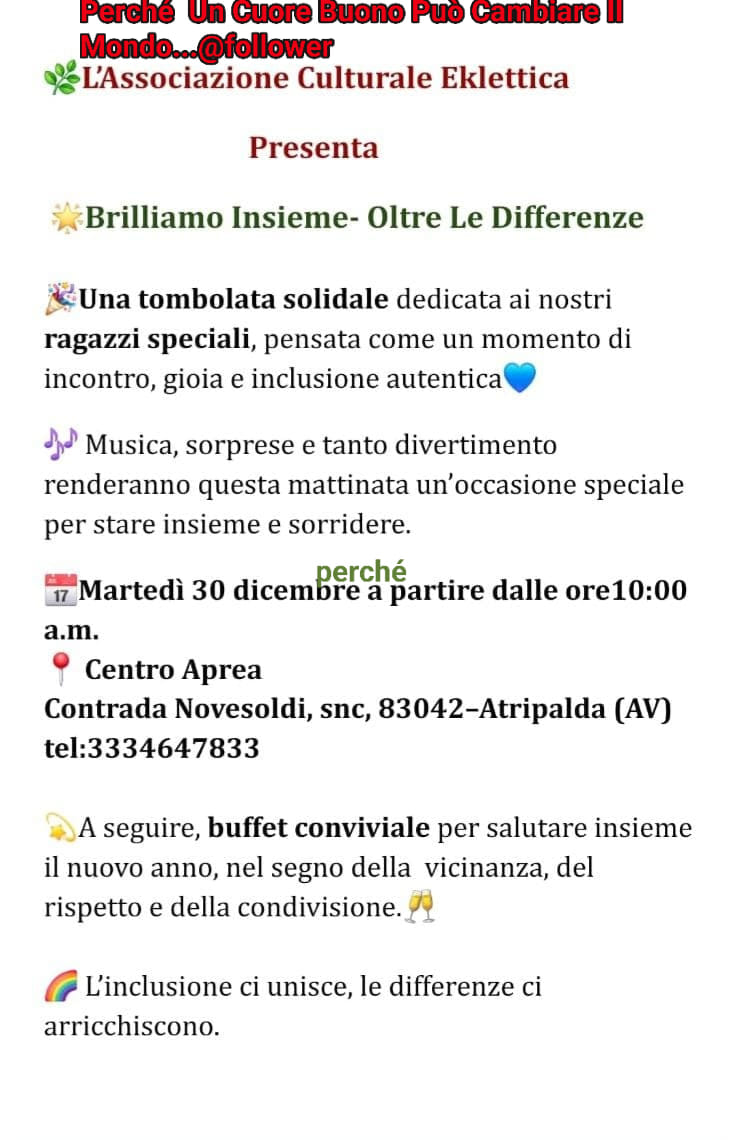 L’Associazione Culturale Eklettica, ente senza fini di lucro attivo sul territorio campano e irpino, che promuove e realizza attività culturali e sociali, presenta “ Brilliamo Insieme-Oltre Le Differenze” : una tombolata solidale, nella mattinata del 30 dicembre , provvedendo all’acquisto dei doni e di buona parte dei premi destinati ai ragazzi speciali del Centro “Enzo Aprea” di Atripalda, in accordo con la responsabile Renata Romano.