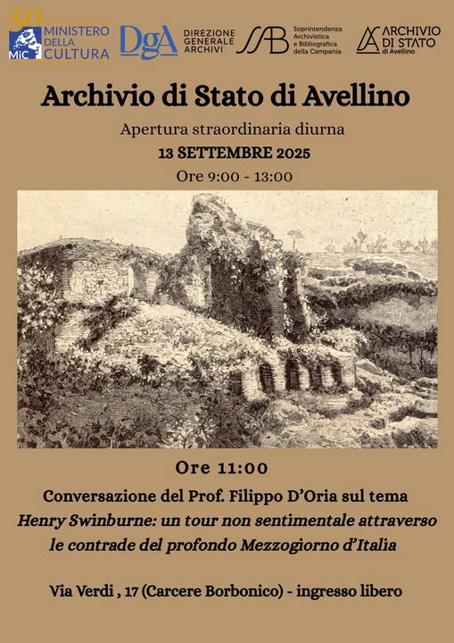 Alle ore 11:00 il Prof. Filippo D’Oria, già docente di Paleografia presso l’Università degli Studi di Napoli “Federico II”, terrà una conversazione sul tema "Henry Swinburne: un tour non sentimentale attraverso le contrade del profondo Mezzogiorno d’Italia".