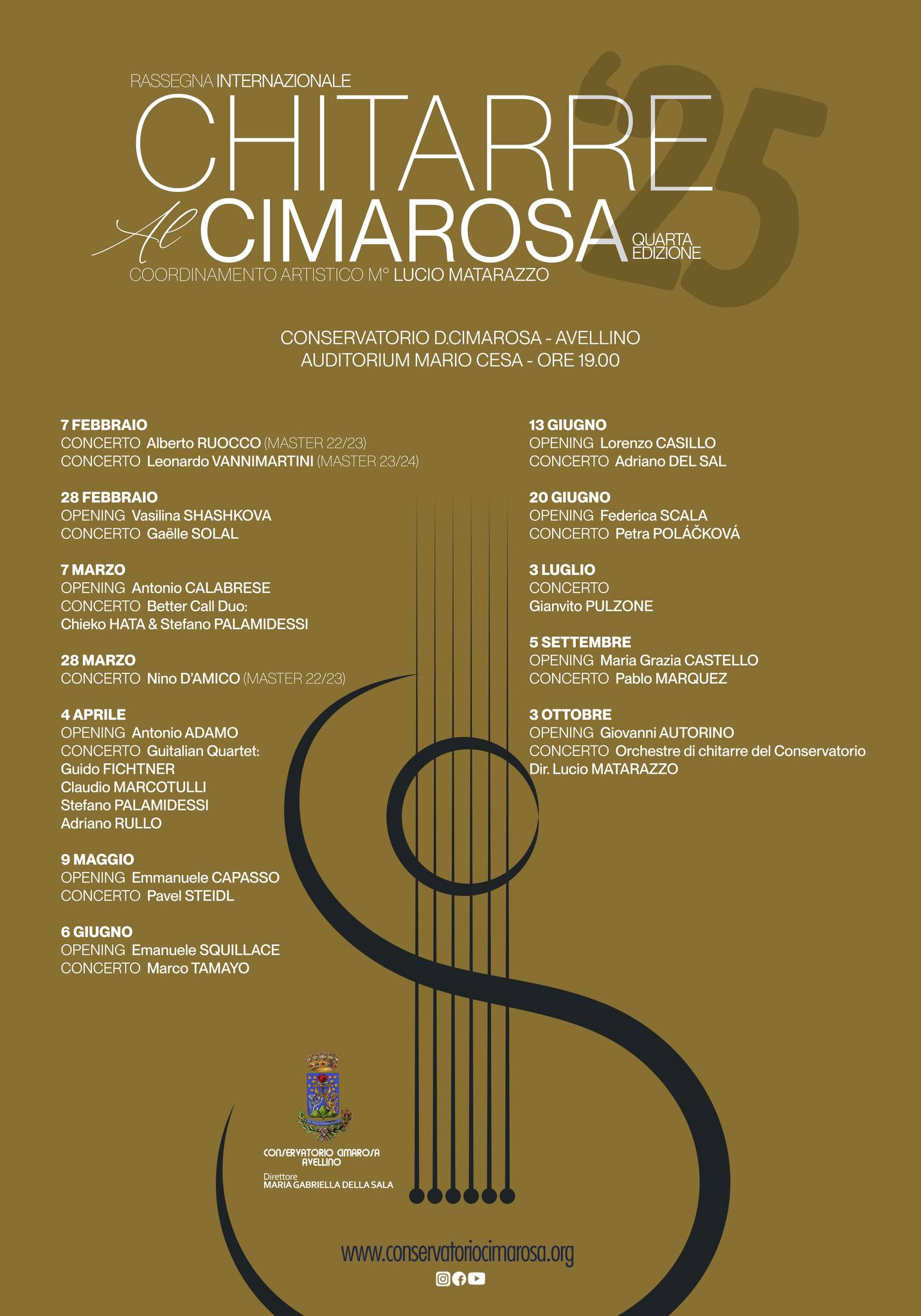 Il Conservatorio Domenico Cimarosa, diretto da Maria Gabriella della Sala, ospita la quarta edizione della rassegna internazionale "Chitarre al Cimarosa", con eventi che spaziano dalla musica classica al jazz, fino alla storia della musica da camera italiana.