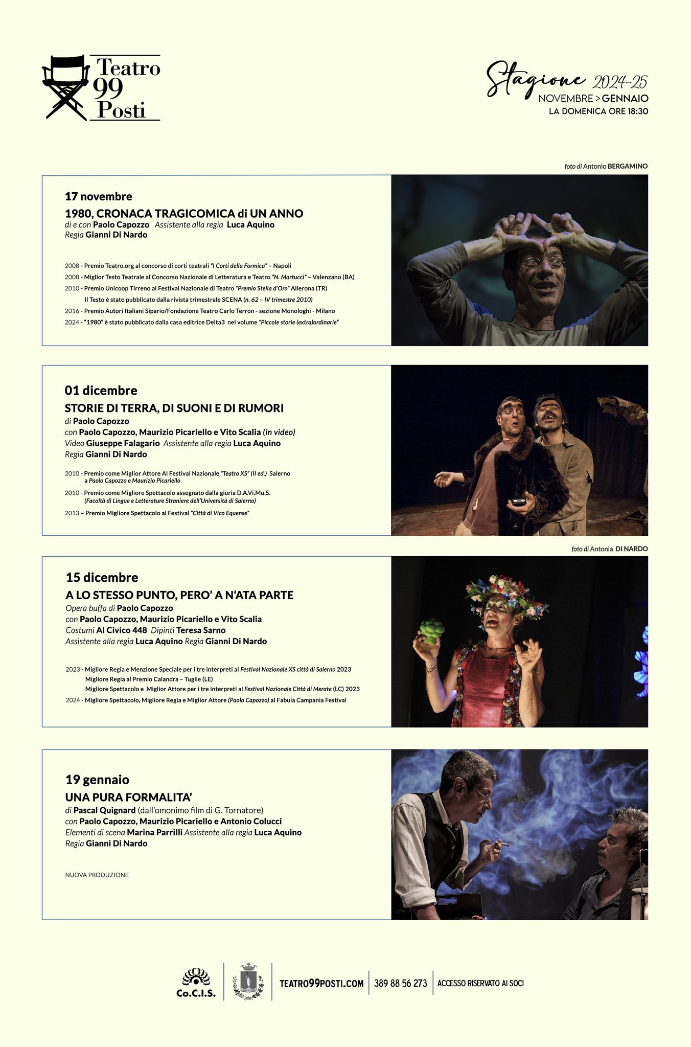Il 19 gennaio 2025 andrà in scena "Una pura formalità" di Pascal Quignard, è una notte fredda e piovosa, un uomo sporco, infangato, in stato confusionale e senza documenti viene fermato e condotto in commissariato. In attesa dell’arrivo del commissario un agente si prodiga per asciugargli i vestiti e rifocillarlo ma si scontra con la riottosa protervia dell’uomo.