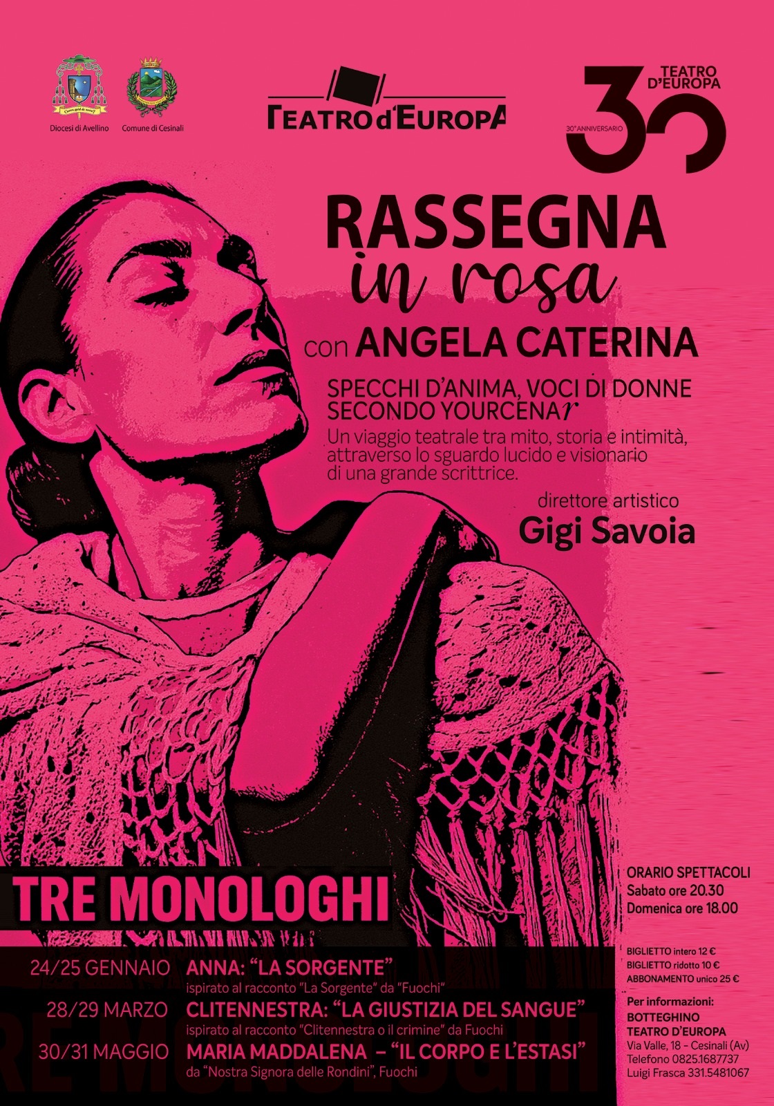 Accanto alla comicità e alla tradizione, il Teatro d’Europa dedica quest’anno un omaggio speciale all’universo femminile con la 'Rassegna in Rosa', interpretata da Angela Caterina. Tre intensi monologhi tratti dalle opere di Marguerite Yourcenar compongono un viaggio profondo nell’anima femminile, tra mito, storia e intimità. Lo spettacolo ‘Anna: La sorgente’, ispirato al racconto ‘La sorgente" da "Fuochi’’- A marzo sarà la volta di ‘Clitennestra: La giustizia del sangue’, tratto da ‘Clitennestra o il crimine’. La rassegna si chiude il 30 e 31 maggio con ‘Maria Maddalena: Il corpo e l’estasi’, tratto da ‘Nostra Signora delle Rondini’.