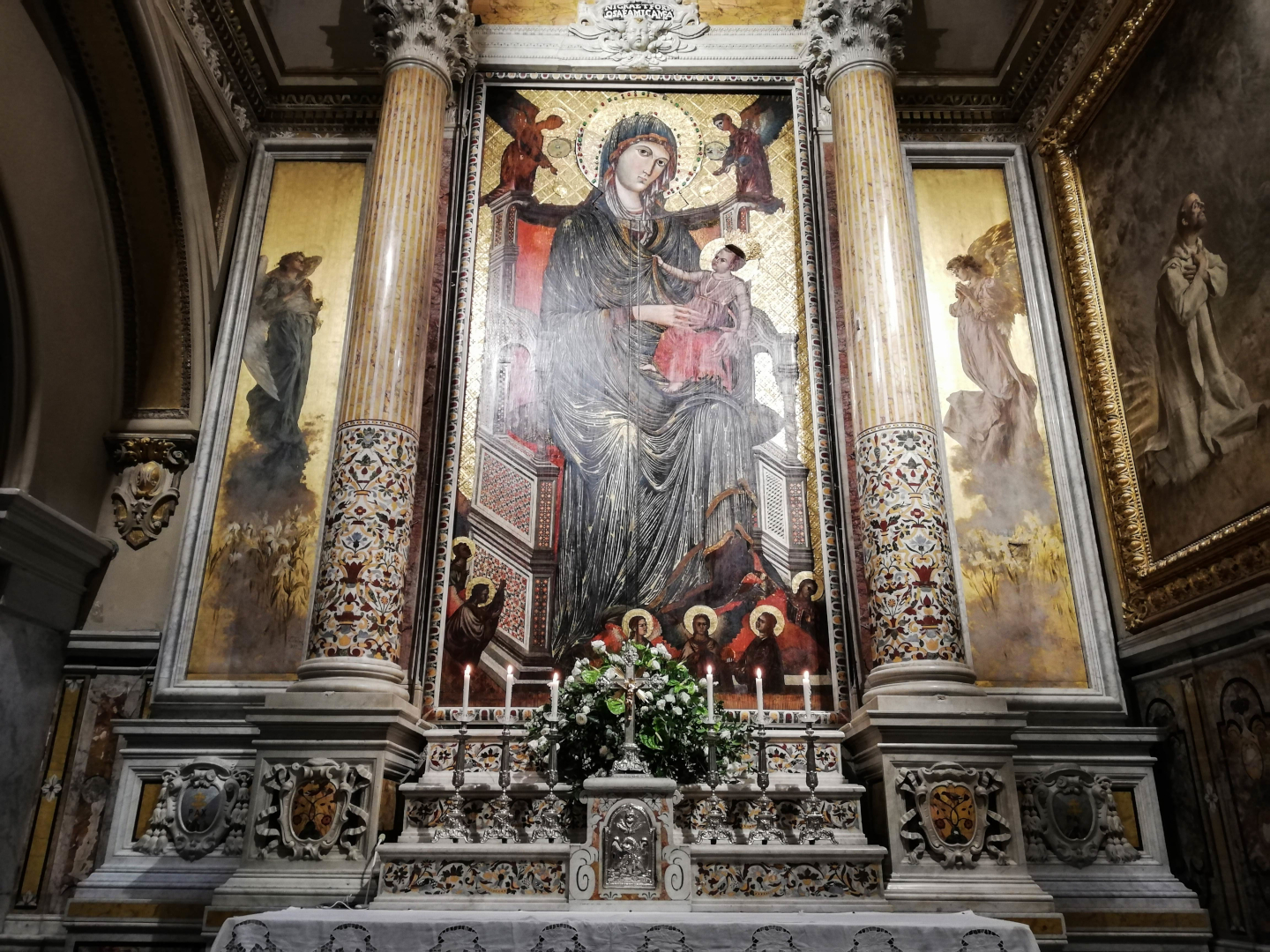 “Chi vo' grazie ra Mamma Schiavona ca sagliesse lu Montagnone”questo è il canto che risuona nel Santuario di Montevergine eretto nell'anno 1126 per volere di San Guglielmo da Vercelli le cui spoglie mortali sono conservate nella cripta della basilica. Questo luogo sacro è legato al culto della Madonna Bruna o anche detta “Mamma Schiavona” che significa straniera o schiava per via dell'icona che la rappresenta con la carnagione scura conservata all’interno dell’Abbazia. La venerazione della Madonna di Montevergine attira fedeli da ogni dove e si stima che ogni anno il Santuario sia visitato da circa un milione e mezzo di pellegrini. La Madonna Bruna viene festeggiata due volte all’anno: il 12 settembre, giorno dedicato a Maria, e il 2 febbraio in occasione della Candelora nella tradizionale “Juta dei Femminielli a Montevergine " legato alla leggenda del 1256 che racconta di due giovani omosessuali che sarebbero stati legati ad un albero sul Monte Partenio e ricoperti di lastre di ghiaccio per punirli. Nel racconto popolare, la Madonna di Montevergine avrebbe fatto apparire un raggio di sole che sciolse il ghiaccio e liberò i due giovani. Questo miracolo rappresenterebbe perciò il legame fondante tra la sacra Icona e i “femminielli” che lo ricordano ogni anno salendo al Monte Partenio tra canti e tammoriate. Altre versioni legano invece questo luogo sacro al culto della dea Cibele. Secondo questa interpretazione nella juta dei femminielli si perpetrerebbe quindi l'usanza dei sacerdoti della dea che una volta all'anno raggiungevano la cima del monte e lì si eviravano in suo onore, in un gesto dal valore rigenerativo. “Statti bona, Maronna mia, è fattu juornu e ngi n'avima ì'” così i pellegrini salutano Mamma Schiavona al termine di una giornata di preghiera gioiosa , versi che rappresentano un arrivederci carico di speranza con l'impegno di tornare al Santuario l’anno successivo e l'augurio di ritornare al fine di poter  ringraziare per le grazie ricevute. “Statti bona, Maronna mia, l'annu chi bene turnamu a benì .Si ngi vengu, ngi vengu sola, l'annu chi bene, nu bellu uaglionu . Si ngi tornu, ngi vengu zita, l'annu chi bene, nu bellu maritu .E si stesseme cchiù bicinu, nge venésseme ognu matina e siccome stamu luntanu, ngi verimu na vot'a l'annu e si nu' nge verìmu r' visu, nge verìmu mparavìsu” (Statti bene, Madonna mia, s'è fatto giorno e dobbiamo partire. Statti bene, Madonna mia, l'anno che viene torniamo a venire. Se ci vengo, ci torno sola, l'anno che viene, con un bel ragazzo. Se ci torno, ci vengo zitella, l'anno che viene, con un bel marito. Se noi fossimo più vicino, ci vedremmo tutte le mattine ma siccome stiamo lontano, ci vediamo una volta l'anno e se non ci vediamo diviso, ci vedremo in Paradiso)