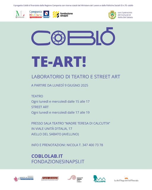 Lunedì 9 giugno presso il "Centro Sociale Madre Teresa di Calcutta" di Aiello del Sabato con il progetto "Te-Art" si terranno due nuovi laboratori artistici di Teatro e Street Art.