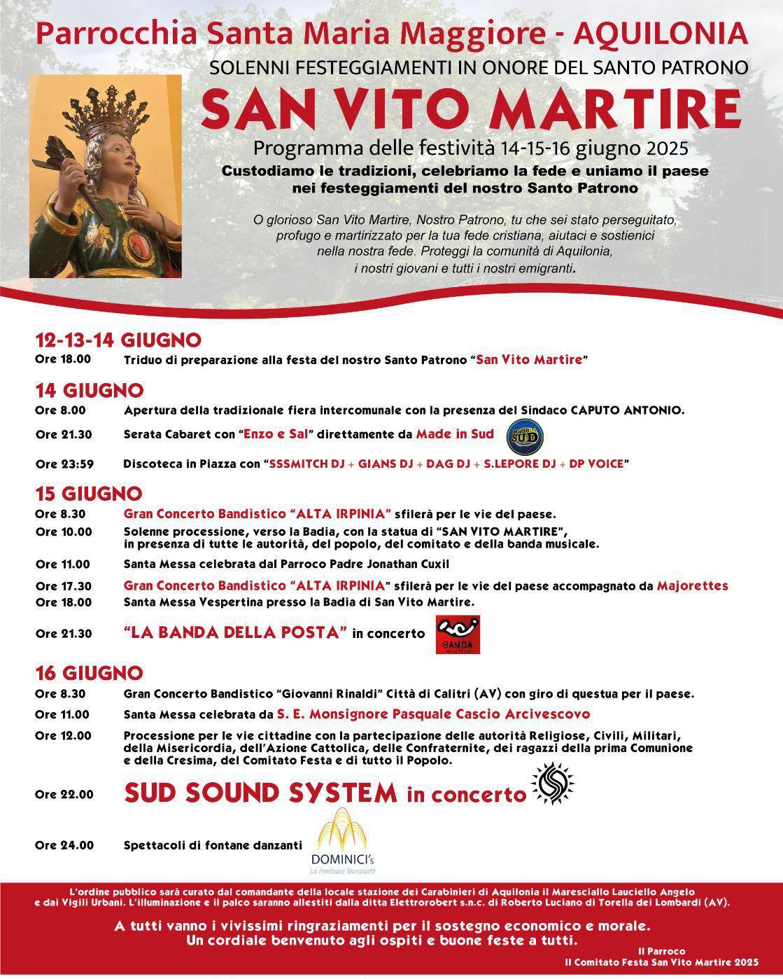 Aquilonia si prepara a vivere uno dei momenti più attesi dell’anno con i solenni festeggiamenti in onore di San Vito Martire, patrono della comunità. Dal 14 al 16 giugno la cittadina sarà animata da un ricco programma di eventi civili che, affiancandosi alle celebrazioni religiose, offriranno intrattenimento, musica e spettacolo per tutte le età.
