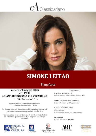 Il programma di "ClassicAriano" si impreziosisce con il concerto di pianoforte della brasiliana Simone Leitão. Appuntamento Venerdì 9 Maggio alle ore 19.30 presso l'omonima sala della rassegna ad Ariano Irpino, in via Calvario 10. Musiche di Scarlatti, Beethoven, Villa-Lobos, Bach/Busoni.