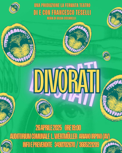 Sabato 26 Aprile, alle ore 19.00, nella città del Tricolle, presso l'Auditorium Comunale "Lina Wertmüller", andrà in scena "Divorati". Regia di Gilda Ciccarelli, di e con Francesco Teselli.