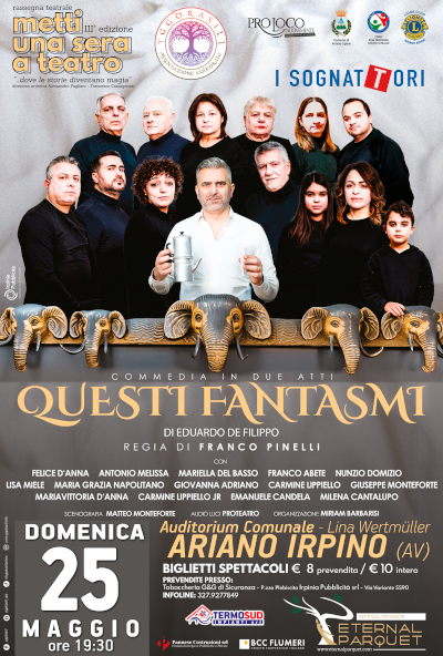 Penultimo appuntamento della rassegna "Metti una sera a teatro", con la direzione artistica di Alessandro Pagliaro e Francesco Castagnozzi. Ritornano in scena I Sognattori con un grande classico: "Questi fantasmi" di Eduardo De Filippo. Appuntamento, Domenica 25 Maggio alle 19.30, all'Auditorium Comunale "Lina Wertmüller" di Ariano Irpino.