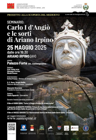 Si svolgerà Domenica 25 Maggio, alle ore 18.00, presso Palazzo Forte (sez. Contemporanea), il seminario dal titolo "Carlo I d’Angiò e le sorti di Ariano Irpino", promosso dall’Associazione Sante Spine APS, con il patrocinio del comune di Ariano Irpino. L'evento ha come riferimento il libro del professore Guido Iorio, "Carlo I d’Angiò e le sorti di Ariano Irpino", che sarà presentato per l'occasione. Saranno presentate, inoltre, le pubblicazioni dell'opuscolo di Giuseppe Perrina e del libro di Nicola Grasso, rispettivamente "Il dono di due Spine della Corona di Cristo alla città di Ariano Irpino da parte del re Carlo d’Angiò" e "La Rievocazione storica del Dono delle Sacre Spine – Il Corteo".