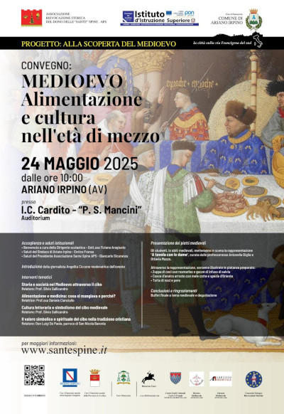 Sabato 24 Maggio, dalle ore 10.00, appuntamento presso l'I.C. Cardito, Auditorium "P.S. Mancini" per il convegno "Medioevo, alimentazione e cultura nell'età di mezzo" promosso dall’Associazione Rievocazione Storica del Dono delle Sante Spine – APS, in collaborazione con l’Istituto d’Istruzione Superiore “G. De Gruttola” e con il patrocinio del Comune di Ariano Irpino. L’evento propone una riflessione multidisciplinare sul cibo come chiave di lettura della società medievale: dalla dieta quotidiana ai significati simbolici e religiosi, fino alla rappresentazione scenica degli alimenti. Gli studenti, in abiti storici, daranno vita alla rievocazione “A tavola con le dame”, con degustazione finale di piatti medievali fedelmente ricostruiti. L’iniziativa si propone come un’occasione di scoperta, dialogo e valorizzazione culturale, rivolta a studenti, appassionati di storia e a tutta la cittadinanza.