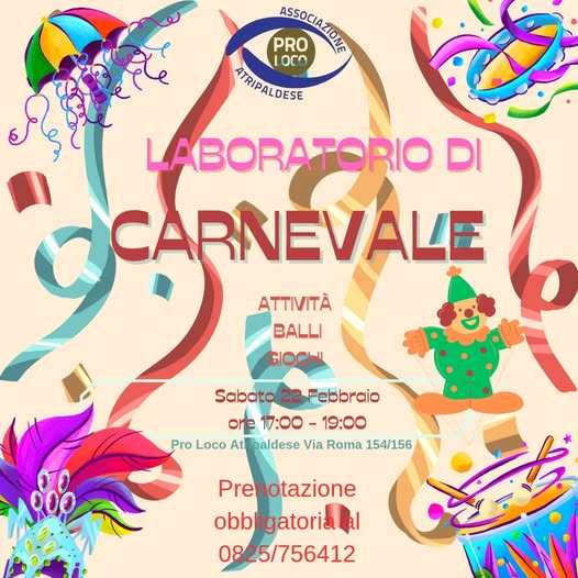 E' il tempo del divertimento per i bambini, la festa più vivida e colorata dell'anno verrà celebrata dalla Pro Loco di Atripalda con il "Laboratorio di Carnevale" dedicato alla fascia d'età 6-10 anni.Un due ore di spasso tra balli, attività a tema e giochi per vivere insieme l'allegria coinvolgente del carnevale.