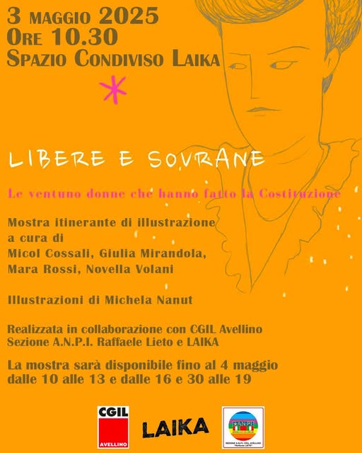 Da sabato 3 maggio presso lo Spazio Laika di Atripalda, sarà possibile visitare la mostra itinerante "Libere e sovrane": le ventuno donne che hanno fatto la Costituzione, l'esposizione è curata da Micol Cossali, Giulia Mirandola, Mara Rossi, Novella Volani con le illustrazioni di Michela Nanut.