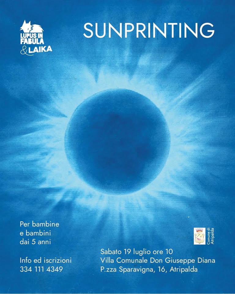 Sabato 19 luglio presso la Villa Don Giuseppe Diana di Atripalda si terrà il laboratorio di fotografia solare "Sunprinting" pensato per bambini dai 5 anni in sù. Con carta, acqua e naturalmente luce solare, si può fermare per sempre l’immagine di un oggetto, immortalare la natura in un meraviglioso blu eterno. L'evento è organizzato dalle associazioni Lupus in Fabula e Laika con il patrocinio del comune di Atripalda.