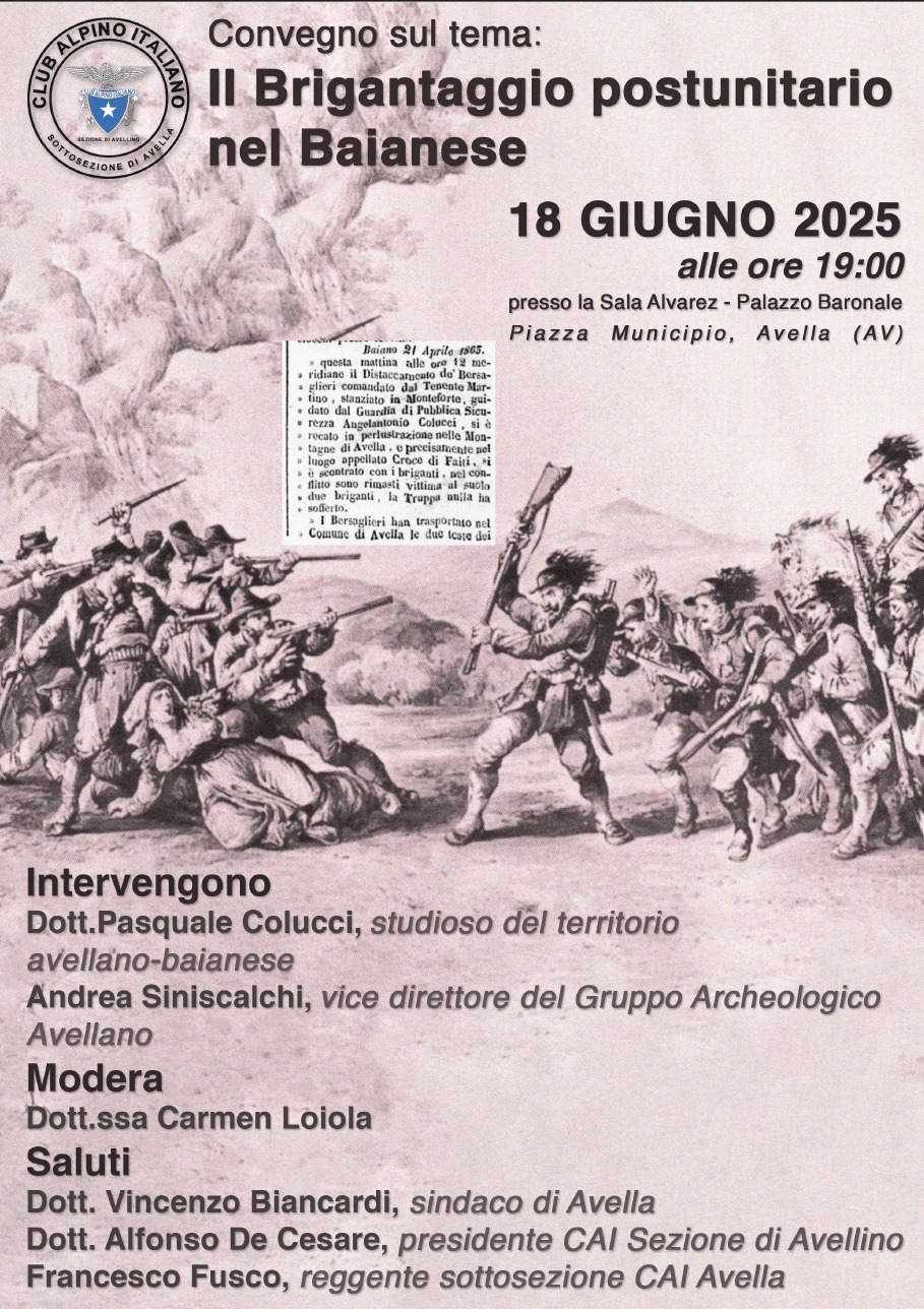 Il Club Alpino Italiano - Sottosezione Avella presenta il convegno storico "Il Brigantaggio Postunitario nel Baianese", in programma Mercoledì 18 Giugno presso la Sala Alvarez del Palazzo Baronale di Avella.
