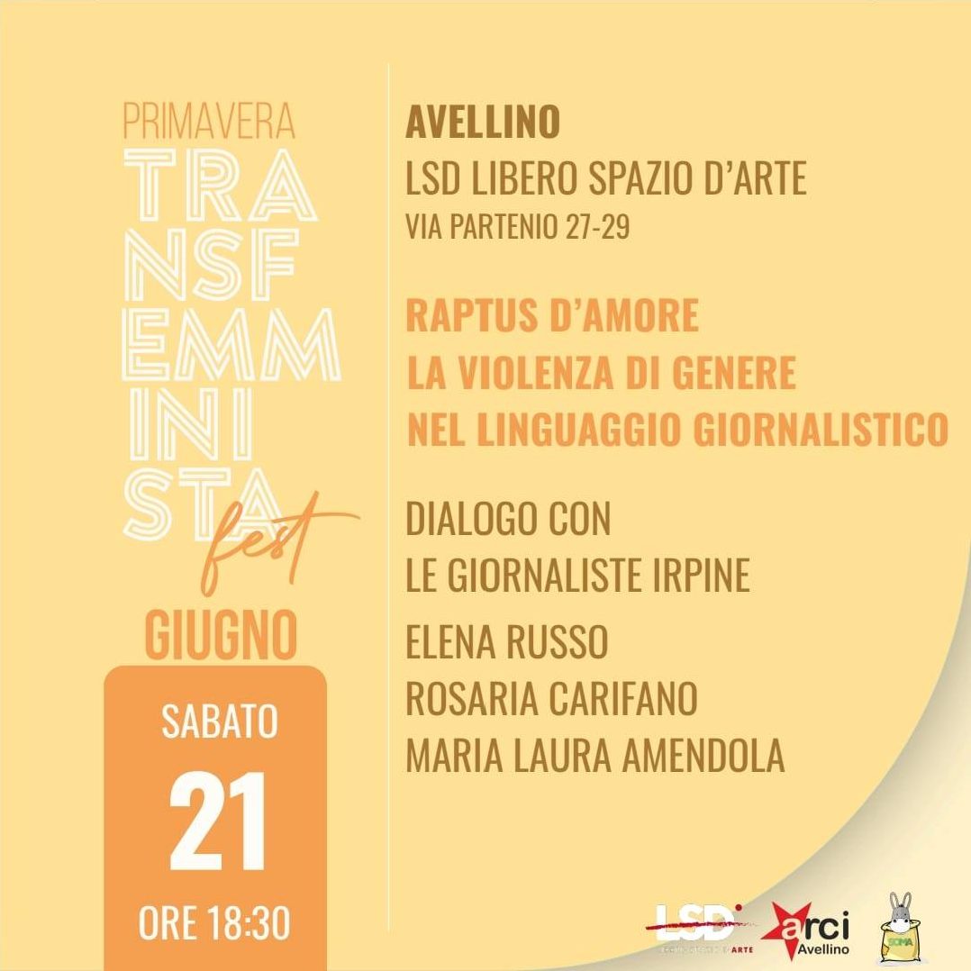 Sabato 21 giugno alle ore 18:30 presso il Libero Spazio D'arte di Via Partenio, l'ultima tappa del festival Primavera Transfemminista con "Raptus d'amore, la violenza di genere nel linguaggio giornalistico".