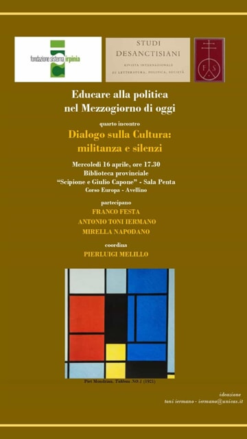 Educare alla politica nel mezzogiorno di oggi. Quarto incontro "Dialogo sulla cultura: militanza e silenzi" ad Avellino mercoledì 16 aprile alle 17.30 nella Sala Penta della biblioteca provinciale "Scipione e Giulio Capone", a corso Europa.