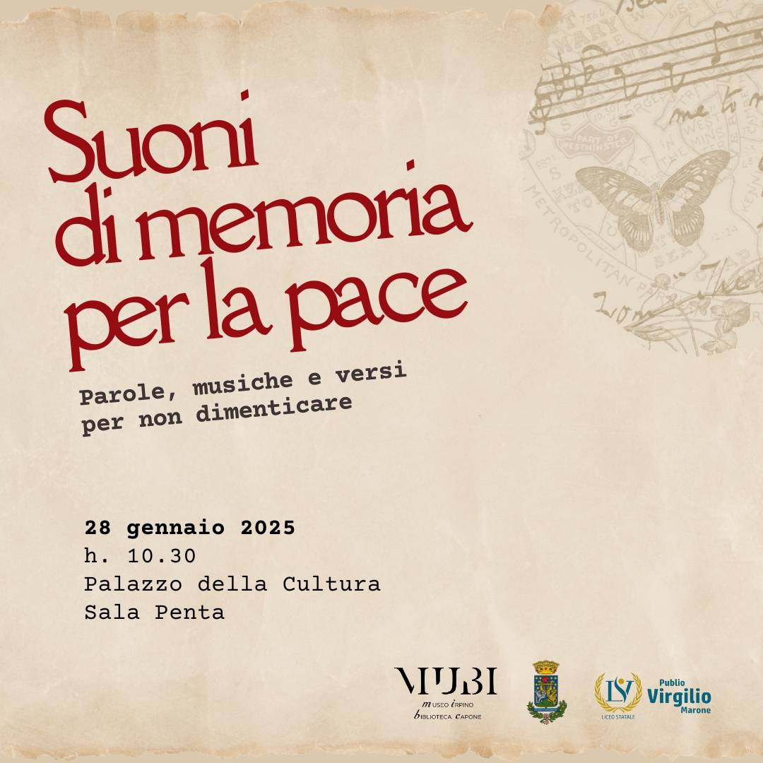 Il Museo Irpino e la Biblioteca Provinciale S. e G. Capone di Avellino in collaborazione con il Conservatorio Domenico Cimarosa e il Liceo Statale Publio Virgilio Marone di Avellino, m𝗮𝗿𝘁𝗲𝗱ì 𝟮𝟴 𝗚𝗲𝗻𝗻𝗮𝗶𝗼 𝟮𝟬𝟮𝟱, alle ore 𝟭𝟬.𝟯𝟬, presso la 𝗦𝗮𝗹𝗮 𝗣𝗲𝗻𝘁𝗮, presentano 𝗦𝗨𝗢𝗡𝗜 𝗗𝗜 𝗠𝗘𝗠𝗢𝗥𝗜𝗔 𝗣𝗘𝗥 𝗟𝗔 𝗣𝗔𝗖𝗘, un incontro di musica e testi in ricordo dei milioni di persone uccise dai genocidi, perché il ricordo del tragico evento si trasformi in giusta indignazione e coscienza civile.