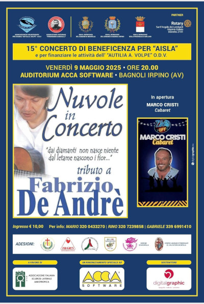 Venerdì 9 Maggio 15° evento di beneficenza Pro SLA a Bagnoli Irpino, presso l'Auditorium Acca Software, alle ore 20.00. Con l'organizzazione dell'Associazione di Volontariato Pro-Disabili "Autilia A.Volpe" ODV e il patrocinio dei Comuni di Montella, Bagnoli Irpino e la Provincia di Avellino, in apertura ci sarà lo spettacolo comico di Marco Cristi. Poi spazio alla strepitosa cover band di Fabrizio De Andrè, "Nuvole in Concerto", a 85 anni dalla nascita del maestro genovese.