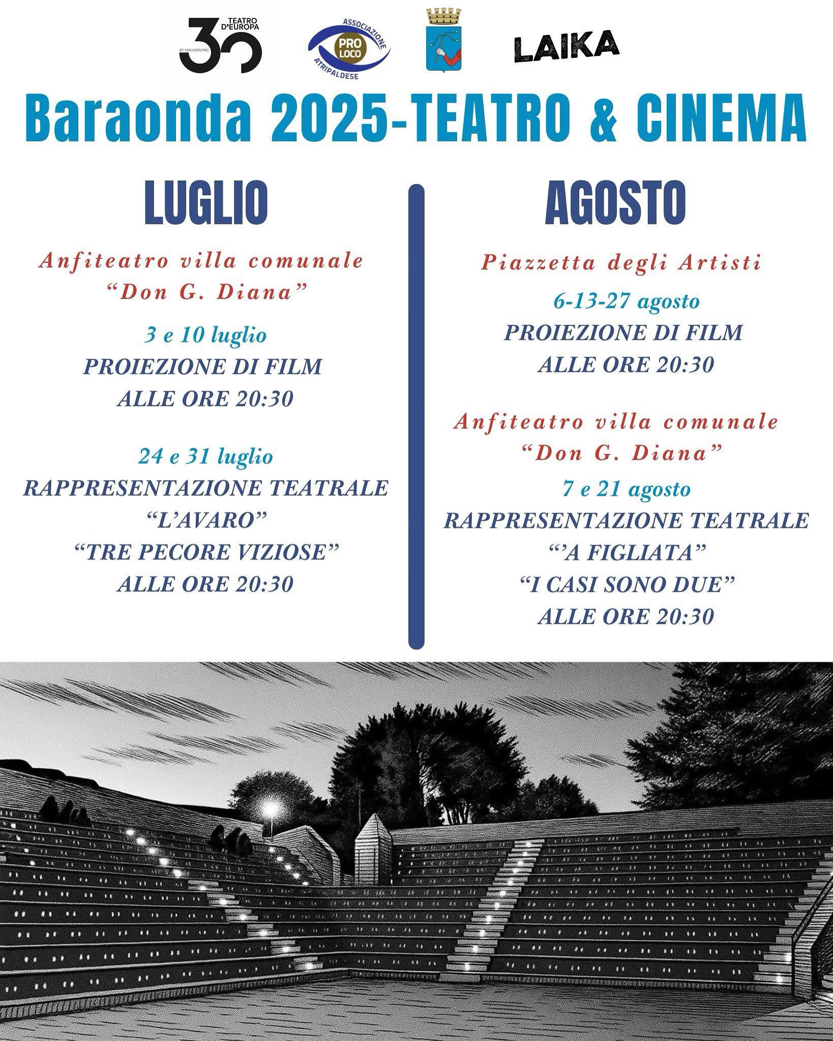 Il cortile di Piazzetta degli Artisti e l'anfiteatro di Villa Don G. Diana saranno sede di proiezioni e spettacoli teatrali.