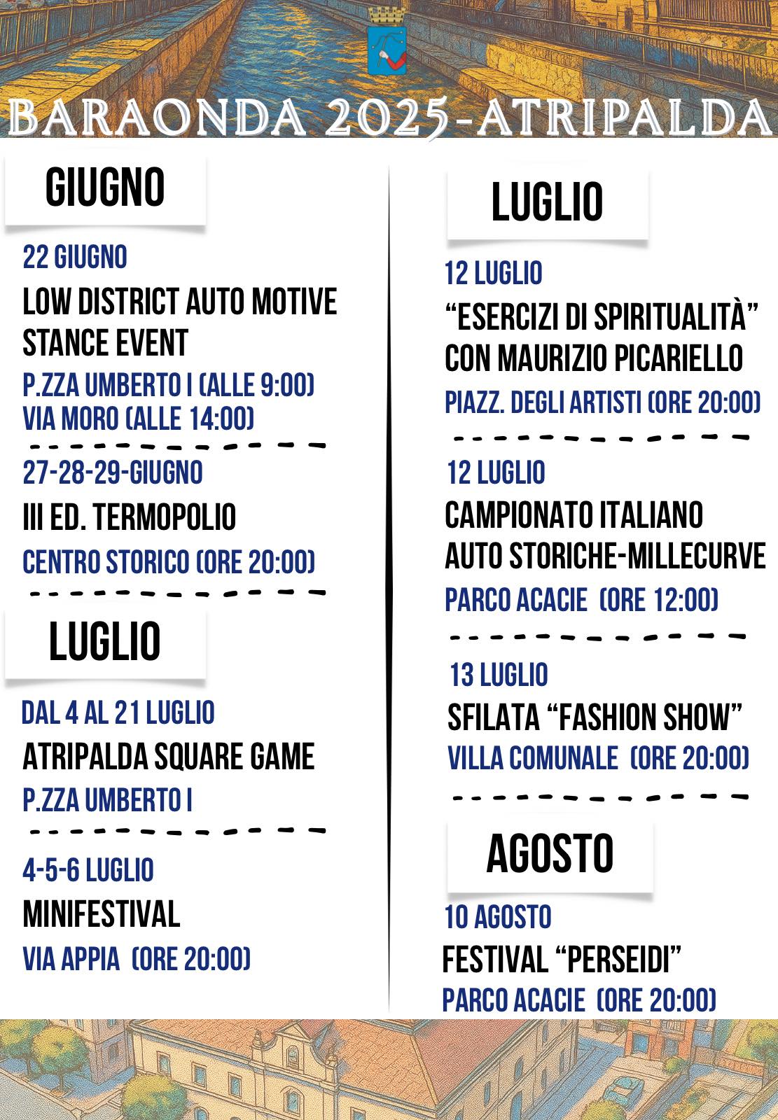 Dal 22 giugno ad Atripalda "sempre in onda non si è" a meno che non si prenda parte alla rassegna "Baraonda" un mix di eventi che scandisce l'estate, un casellario di emozioni da vivere prima di partire per le vacanze o appena dopo il rientro perchè "sempre al mare non si è" ma il programma puoi averlo in casa.