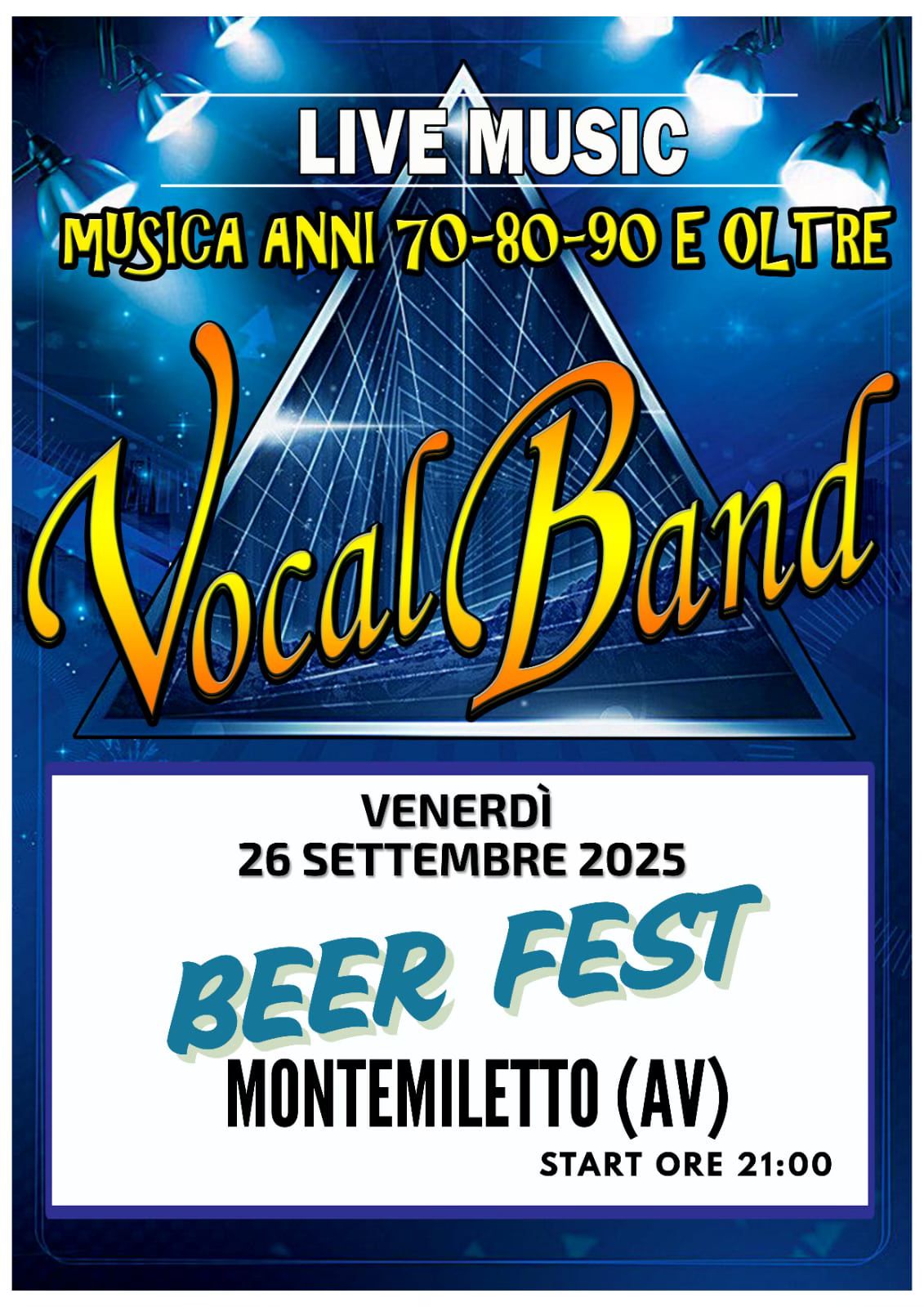 Il programma musicale prevede due appuntamenti principali: venerdì 26 settembre, alle ore 21:00, concerto della Vocal Band, con un repertorio dedicato ai grandi successi degli anni ’70, ’80, ’90 e oltre; sabato 27 settembre, alle ore 21:00, esibizione della cover band “Anima Spericolata”, tributo ufficiale a Vasco Rossi.