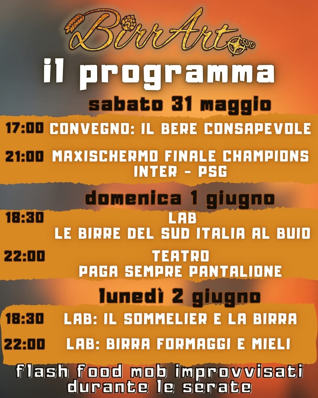 A scelta nelle serate si potrà simulare un'alzata di "Coppa Campioni" impugnando un boccale strabordante di birra, nel giorno a seguire si potrà assistere allo spettacolo di narrazione in tecnica di commedia dell'arte a cura di Roberto Galluccio; in alternativa c'è la possibilità di immergersi in una blind tasting tutta da vivere.
