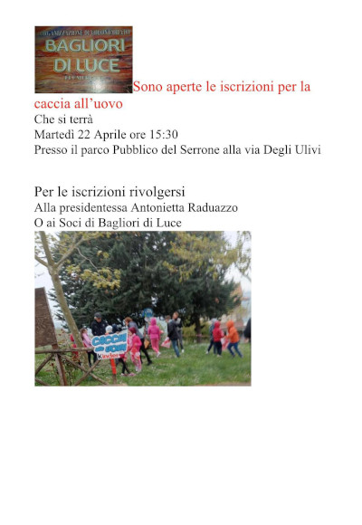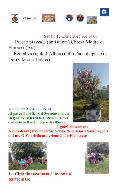 A Flumeri è "Caccia all'Uovo", l'appuntamento organizzato dall'associazione Bagliori di Luce si terrà Martedì 22 Aprile alle ore 15.30 presso il Parco pubblico di località Serrone, in via degli Ulivi. L'evento sarà preceduto dalla benedizione dell'Albero della Pace da parte di Don Claudio Lettieri, Sabato 12 Aprile alle ore 17.00, nel piazzale antistante la Chiesa Madre di Flumeri.