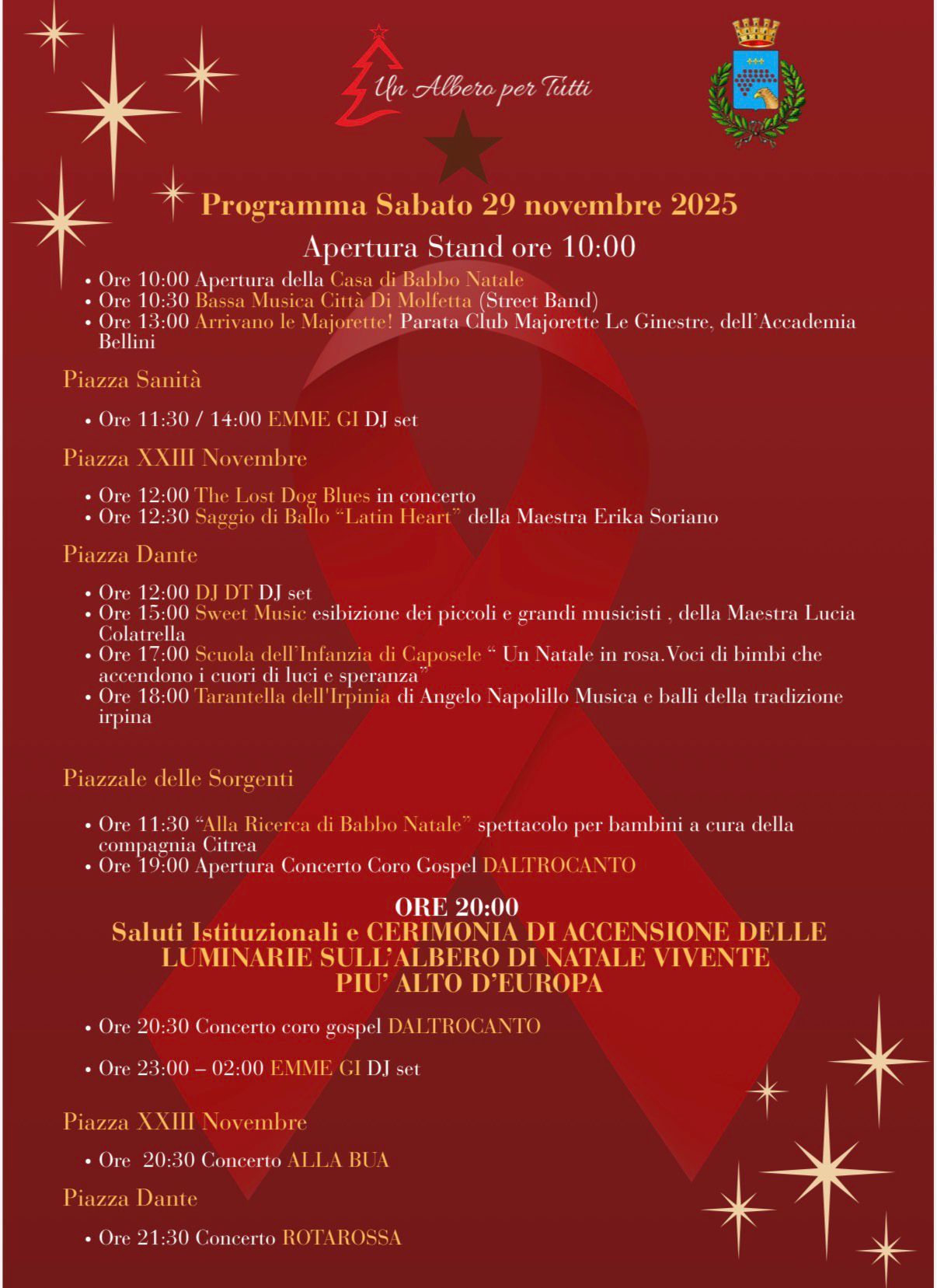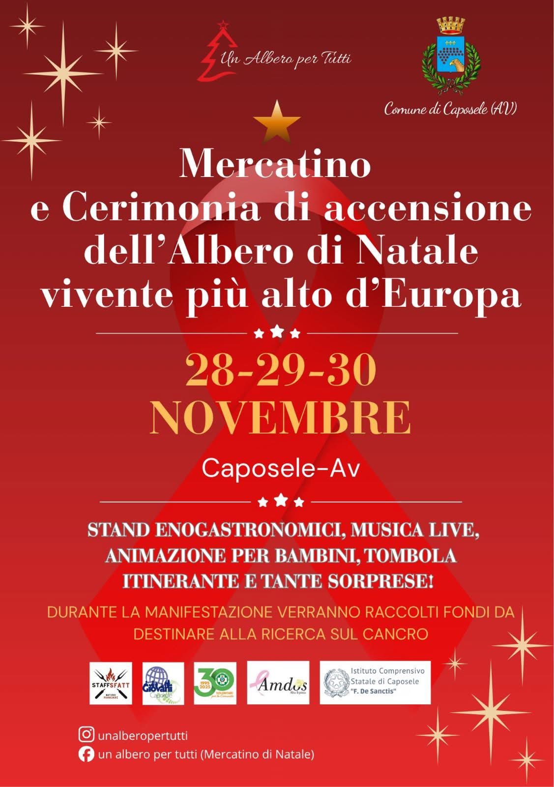 Caposele dal 28 al 30 novembre si trasformerà in un autentico villaggio natalizio, pronto ad accogliere visitatori da ogni parte d’Italia per uno degli appuntamenti più attesi del periodo: il Mercatino di Natale di Caposele e la cerimonia di accensione dell’Albero di Natale vivente più alto d’Europa.