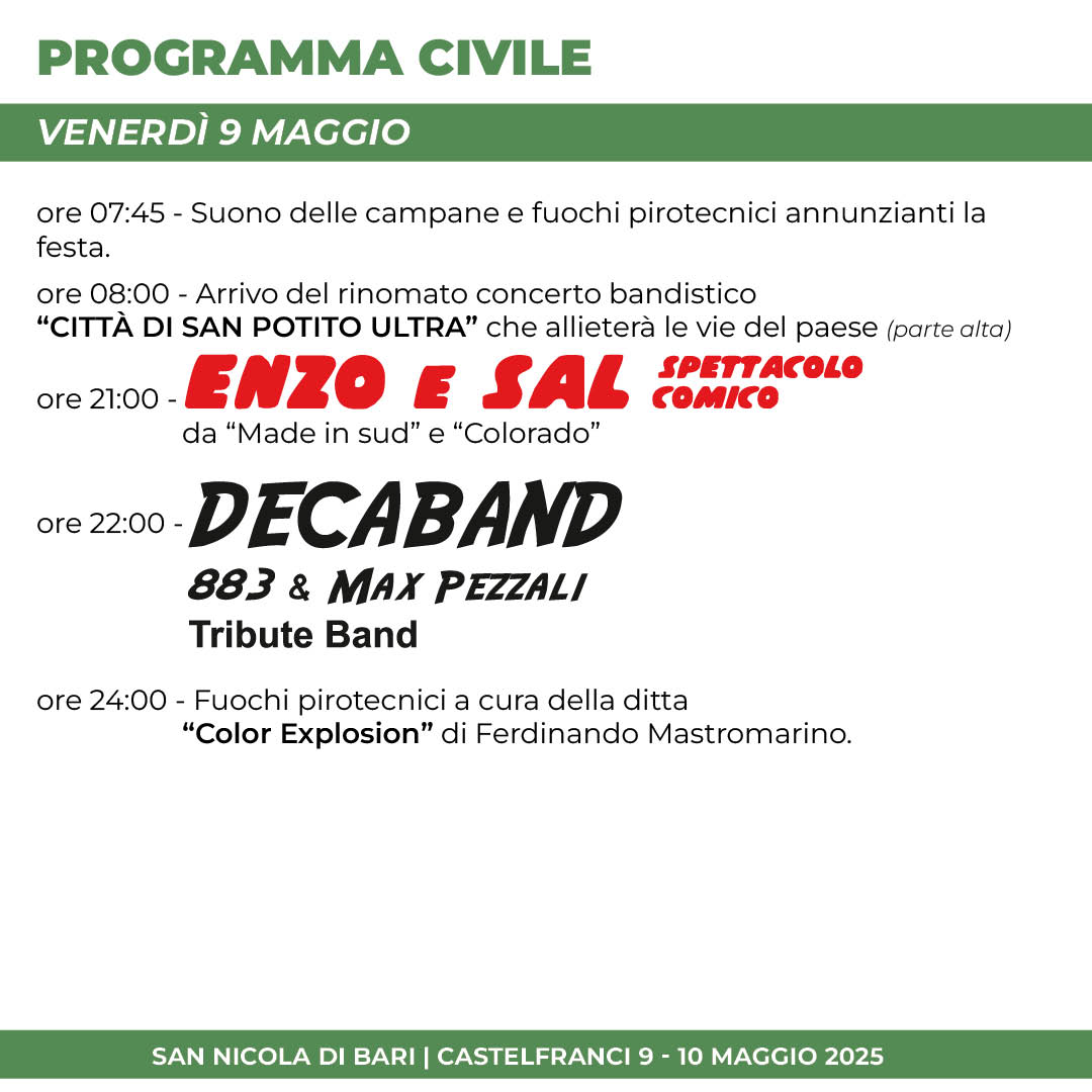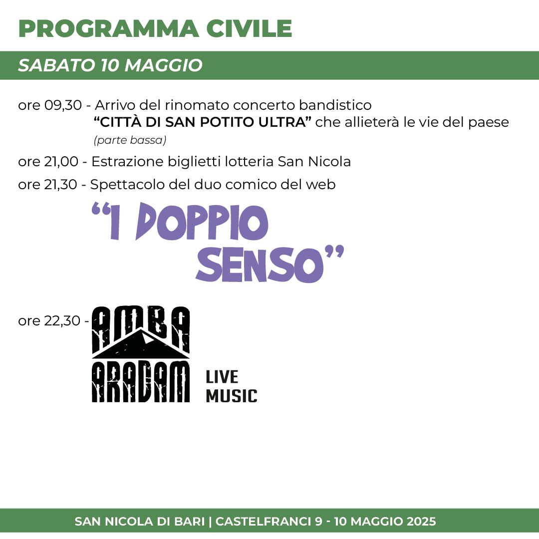 Il programma proseguirà sabato 10 maggio alle 09:30 la banda “Città di San Potito Ultra” tornerà ad animare le strade, questa volta nella parte bassa del paese. In serata, alle ore 21:00, si terrà l’attesa estrazione della lotteria di San Nicola. Subito dopo, alle 21:30, sarà il turno del duo comico “I Doppio Senso”, conosciuto per la loro comicità sul web. Gran finale alle 22:30 con la musica dal vivo degli “Amba Aradam”, che porteranno energia e ritmo per concludere in bellezza la festa.