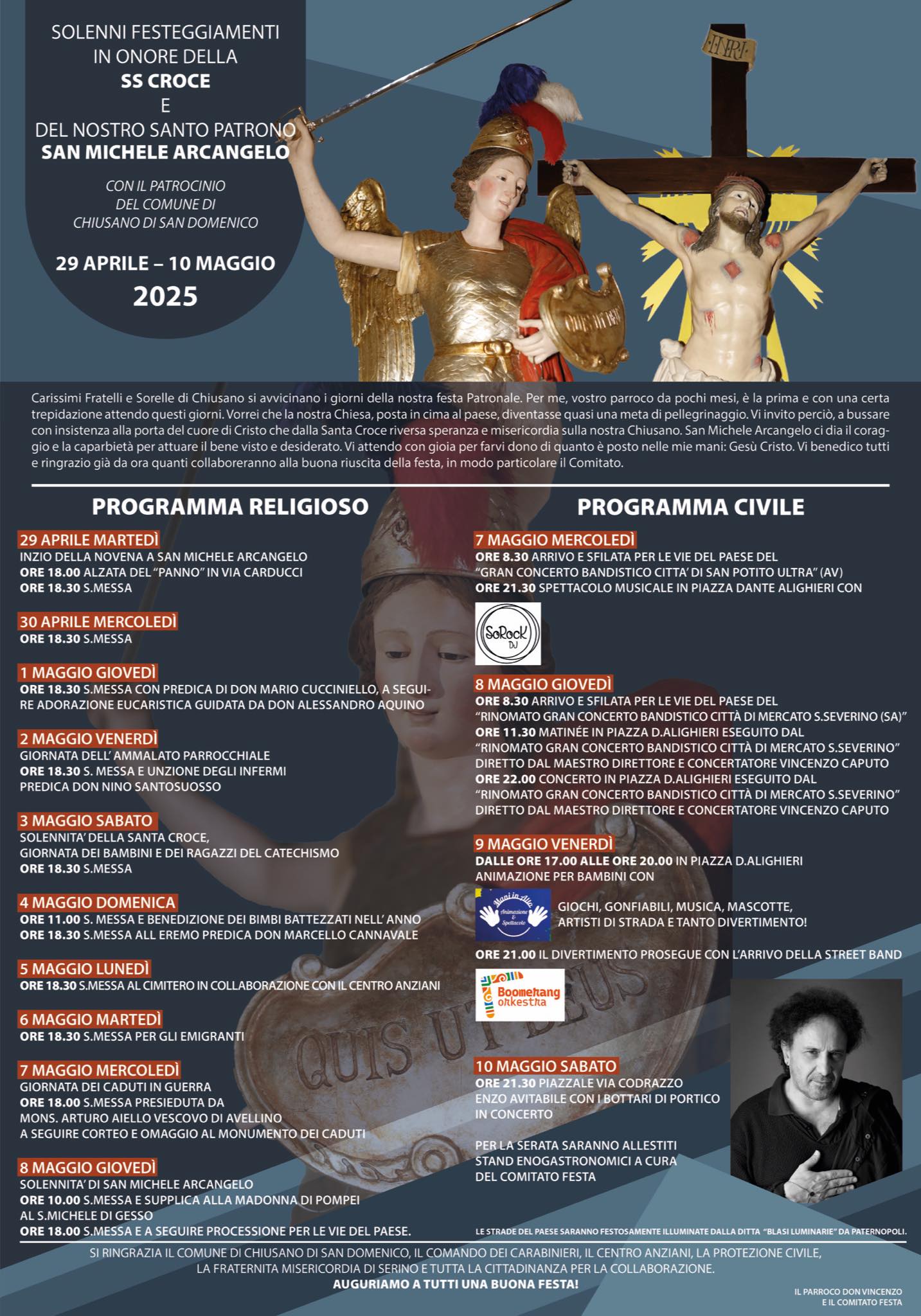 Chiusano di San Domenico si prepara a vivere dieci giorni di celebrazioni in onore della SS. Croce e del patrono San Michele Arcangelo. L’evento, patrocinato dal Comune, rappresenta un appuntamento imperdibile per la comunità, con un ricco programma religioso e civile che unisce spiritualità, tradizione e divertimento.