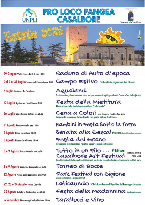 Svelato il Calendario dell'estate a Casalbore, dal 29 giugno al 6 settembre eventi legati alla tradizione, gite per i più giovani, raduno d'auto d'epoca e altre iniziativa allieteranno il periodo estivo.