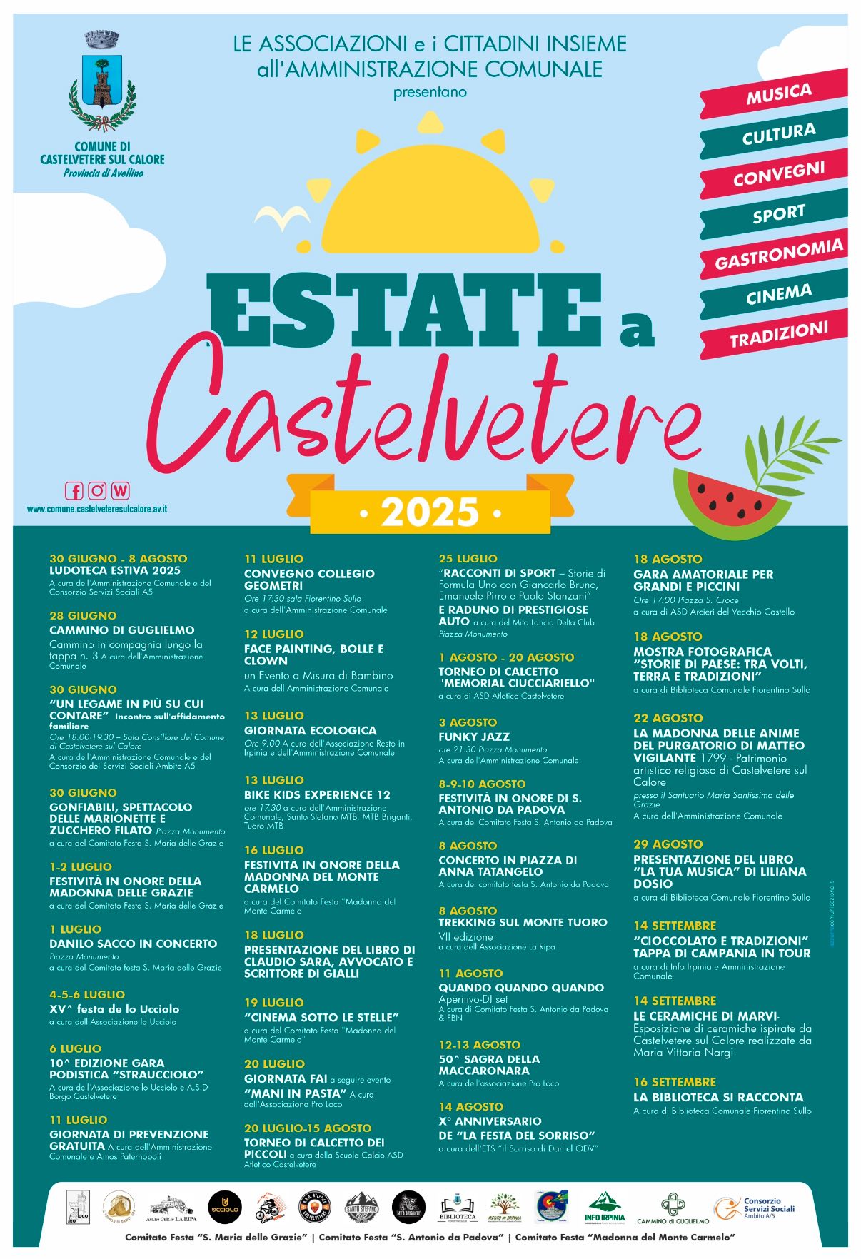 Il Comune di Castelvetere sul Calore, in collaborazione con le associazioni locali e i cittadini, ha ufficialmente lanciato il programma di eventi per “Estate a Castelvetere 2025”, una rassegna estiva ricca di appuntamenti che spaziano dalla cultura alla gastronomia, dallo sport alle tradizioni popolari.