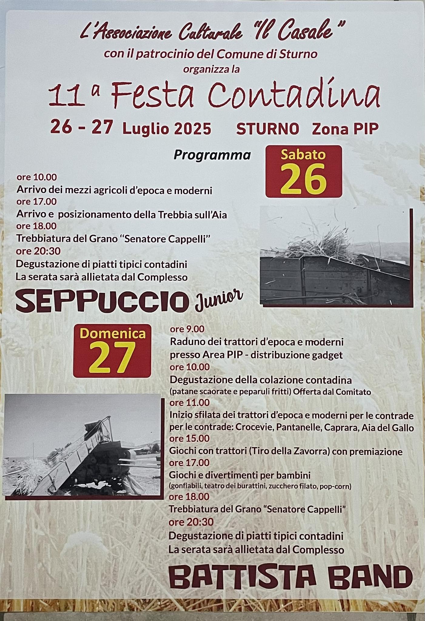 L’Associazione Culturale ‘Il Casale’, con il patrocinio del Comune di Sturno, organizza la 11ª Festa Contadina nei giorni 26 e 27 luglio nella zona PIP della cittadina irpina, con un ricco programma che celebra la civiltà agricola e i suoi antichi saperi.