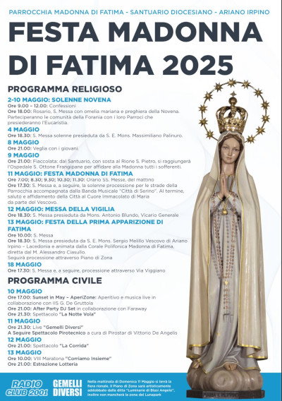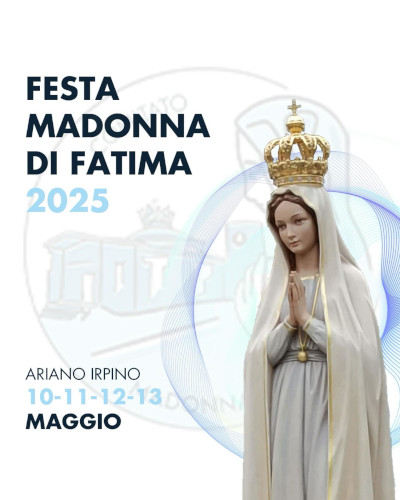 Ariano Irpino è pronta per la "Festa Madonna di Fatima 2025", da Sabato 10 a Martedì 13 Maggio. Dallo scorso Venerdì 2 Maggio ha preso il via il programma religioso in cui ci sarà spazio per la Processione, la Veglia con i giovani, la Fiaccolata e i numerosi altri momenti di spiritualità. Una tradizione di Rione Cardito, dove è ubicato il Santuario Diocesano Madonna di Fatima e di tutta la città del Tricolle. Il programma civile sarà contrassegnato da tanta bella musica, Domenica 11 Maggio live Gemelli DiVersi, spettacolo pirotecnico, gastronomia, "La Corrida", Maratona, Fiera rionale, luminarie, Luna Park ed estrazione della Lotteria.