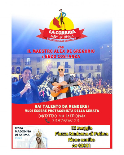 Ore 21.00: Spettacolo "La Corrida" con il maestro Alex de Gregorio ed Enzo Costanza. La Corrida made in Irpinia per una delle tradizioni più emozionanti e coinvolgenti. Un evento che non mancherà di far battere il cuore di tutti, grandi e piccoli. Una serata di puro spettacolo: risate, emozioni e, naturalmente, tanto divertimento. I coraggiosi concorrenti, con la loro grinta e il loro spirito di sfida, si cimenteranno in prove esilaranti, improvvisando in modo brillante davanti a un pubblico caloroso e pronto a incitare i propri beniamini. Ogni partecipante darà il massimo in un mix perfetto di spontaneità e sollazzo