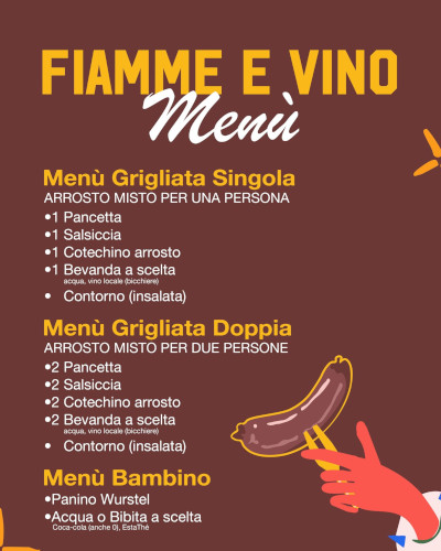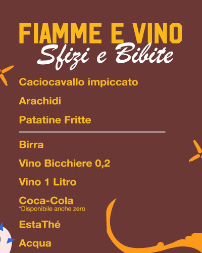 Tanta buona enogastronomia con la grigliata singola, la grigliata doppia (per due persone), il menù bambino, sfizi e bibite tra cui caciocavallo impiccato, arachidi, patatine fritte, vino e birra.