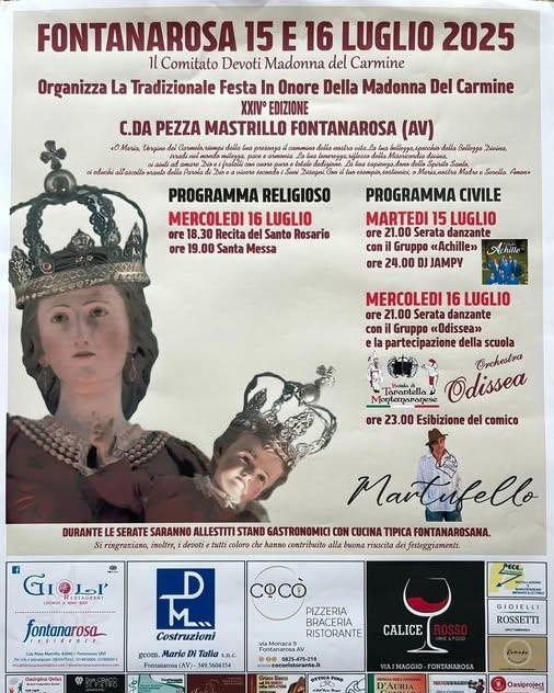 Martedì 15 e Mercoledì 16 Luglio la  XXIV° edizione della Festa in onore della Madonna del Carmine a Fontanarosa, in contrada Pezza Mastrillo, nei pressi del Museo Civico. Musica, gastronomia e comicità renderanno le serate divertenti e gustose.
